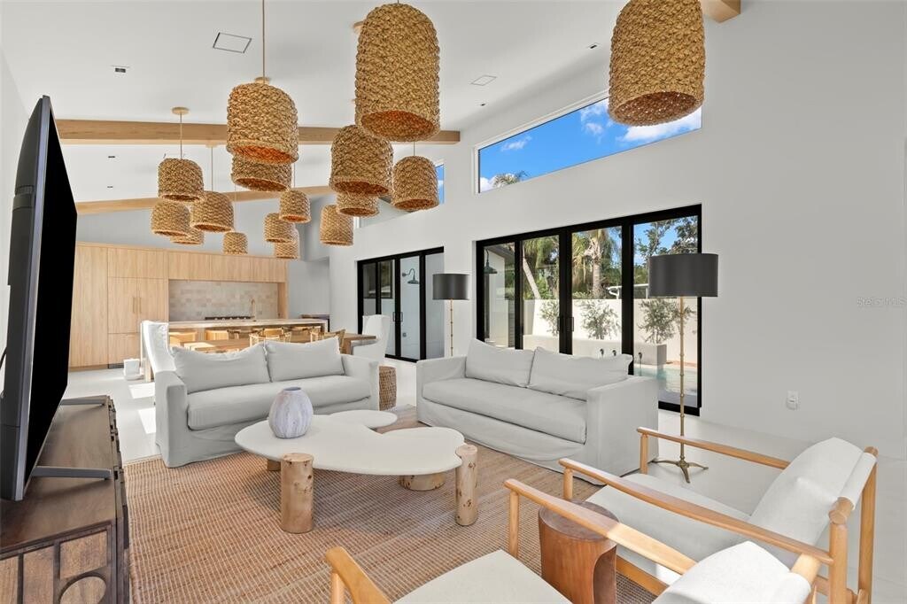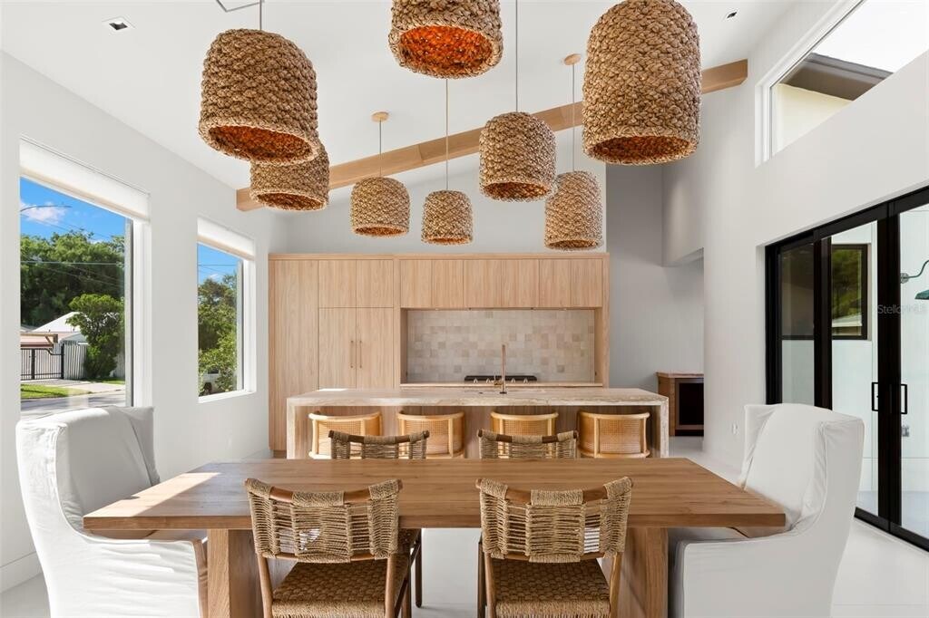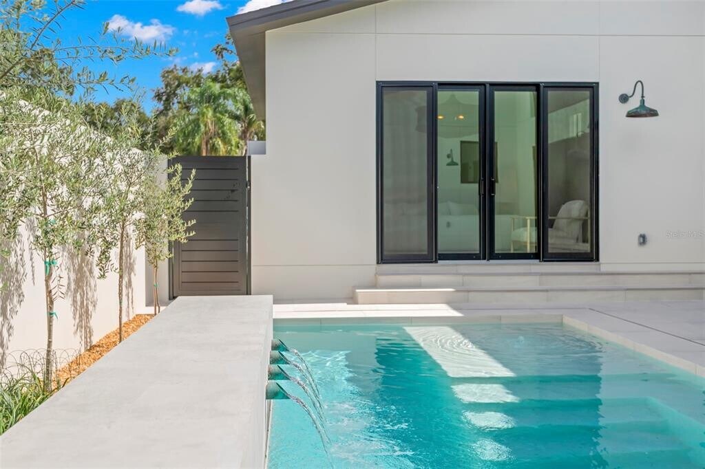 Welcome to a truly exceptional rental residence,thoughtfully designed and newly built in 2025 by renowned builder Kasper Modern. This one-of-a-kind home blends mid-century modern architecture with a refined Japandi aesthetic,offering a calm and elevated living experience centered around light,texture,and seamless indoor-outdoor flow. Designed with intention,the home wraps around a private pool courtyard,where expansive sliding doors open to a tranquil water feature,creating a peaceful,resort-style atmosphere throughout. The main home features a split floor plan with 3 bedrooms and 2.5 baths,providing both privacy and functionality. Every detail has been carefully curated,from the level 5 wall finish to the oversized 4’ x 4’ porcelain tile flooring that flows throughout the entire space. The kitchen serves as a stunning focal point with custom European cabinetry,natural travertine countertops,handmade zellige tile backsplash,a gas range with luxury appliances,an integrated below-counter microwave,and a built-in bar complete with wine and beverage refrigerators. The primary suite offers a spa-like retreat with handmade Zia cement tile,high-end Brizo fixtures,and serene finishes that embody the home’s Japandi design. Thoughtful upgrades include a custom lighting installation in the main living area that creates a striking visual element during the day and warm ambient lighting at night,hurricane-impact windows with integrated blinds,a gas on-demand water heater,and a gas dryer. Multiple rooms open directly to the pool area,enhancing the seamless connection between indoor and outdoor living. The enclosed backyard offers total privacy,centered around a beautifully designed pool and lounge space that feels like a private retreat—especially when the home is opened up to enjoy the soothing sound of the water feature. Located in a non-flood zone and just minutes from downtown St. Petersburg and the beaches,this home combines peace of mind with convenience. Designer furnishings are available,making this a rare opportunity to lease a fully curated,high-end residence that truly stands apart. MLS# TB8495654