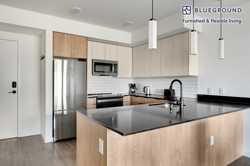 Feel at home wherever you choose to live with Blueground. You’ll love this bright New Tacoma furnished one bedroom apartment with its modern decor, fully equipped kitchen, and comfortable living room. Ideally located, you’re close to all the best that Tacoma has to offer! (ID #SEA957) The advertised rate of $1,380/month is the lowest available price, based on a 2 month(s) and 29 day(s) stay with a move-in date of November 26, 2025. If you’re looking for a 1-year stay, the rate is $1,710/month. Rates vary depending on the duration of stay, season, and other parameters. For exact pricing and additional pricing components, please visit our website and enter your desired move-in and move-out dates. The rate is applicable when billed upfront; it can be higher if billed in multiple payments. Brokers are welcome to reach out. Were you looking for an unfurnished lease? Try Blueground instead and upgrade from unfurnished to furnished living: - Furnished at rates comparable to unfurnished - No setup or furniture costs - save thousands - Move-in ready - save time, just bring your suitcase Designed with you in mind Thoughtfully designed with bespoke finishes, modern furnishings, and a fully equipped kitchen, you’ll enjoy that “I’m home” feeling with this Blueground apartment. Whether you’re lounging in your cozy living room streaming the latest and greatest entertainment on the smart TV or premium wireless speaker, or getting some well-earned rest on the superior quality mattress with luxury linens, you’ll fall in love with everything this New Tacoma apartment has to offer. This apartment also offers in-apartment laundry. Sleeping arrangements Queen Bed, 63in/160cm Amenities Building amenities unique to this one bedroom apartment include an on-site: - Dryer - Elevator - Washing machine - Lounge - Parking - Pets allowed Arrival and ongoing support The entire apartment is yours to enjoy! Throughout your stay, you’ll have access to our Client Experience team through the Blueground App. You can schedule additional cleanings, submit maintenance requests, and view our neighborhood recommendations with just a few taps. We’ll share all details upon confirmation of your stay. Other things to note Building amenities may have an extra cost. This Blueground apartment has flexible lease options, allowing you to book it for one month, a year, or more. Pets are welcome, though weight limits and breed restrictions apply and may incur fees. Parking is offered based on availability and is subject to a fee. We take great pride in ensuring every photo displayed is shot in our own units with our actual furnishings. That said, we regularly refresh our decor and furniture arrangement, which may differ from what’s pictured. [SI]