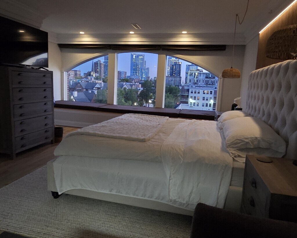 This one-of-kind penthouse southeast corner loft unit has 18-foot floor-to-ceiling windows and two balconies to enjoy breathtaking city views of Milwaukee. Countless luxury upgrades and finishes, including granite countertops accenting the sleek and modern black cabinetry, and a custom tiled kitchen island that comes alive at night with unique LED indirect lighting. All new black stainless appliances, marble gas fireplace, smart thermostat, remote-control blinds, natural gas Weber grill, and gigabit Zentro internet included. Wi-Fi connected light switches and dimmers span the entire home and can be controlled by voice and smart home apps. New luxury plank flooring covers the entire main level and upstairs loft, where you’ll find an expansive primary bedroom with unmatched city views. There’s a custom-built walk-in closet, a 17-foot window bench, in-unit laundry, and a dramatic wood-slat accent wall with integrated LED down-lighting and boho pendant fixtures. The ensuite bathroom features luxurious limestone tiling, dual sink vanity, frameless glass shower, and a jetted tub with Kohler fixtures. The second bedroom on the main level could double as a den or office, with its French door entrance, south and east facing windows, and a barndoor bifold closet. The guest bathroom on the main level features a frameless glass shower and some of the most unique styling you’ll see in the city. Jade tile and wavy wall paneling glow with a lighting surround that you’ll just have to see to believe! Two indoor heated garage parking spots are included, and a generously-sized storage unit in the basement. The building includes two elevators, ButterflyMX touch screen intercom, keyless fob entry doors, and a security camera system that residents can monitor from their phones. Community amenities include a large courtyard, gym, and party room with full kitchen (currently under renovation, available early 2026). Fully or partially furnished options are available at additional cost.
