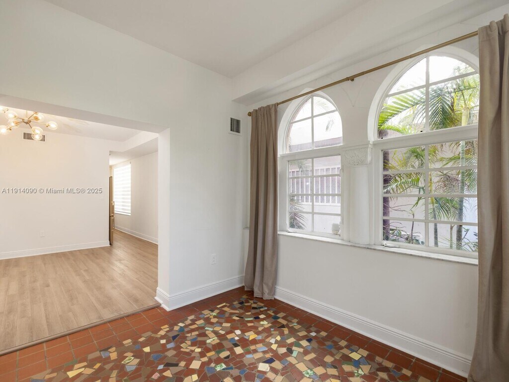 Welcome to The Danton Deco Dream! This charming and spacious first-floor 2bed/2bath unit has been completely updated with modern finishes that complement its original Art Deco character. The picture-perfect entry sunroom with beautiful cathedral windows, column details, and original quarry tile floors, can be used as an office space or cozy sitting room. Large and versatile living space flows through to the like-new designer galley kitchen with stainless appliances and chic brass details. Dreamy sleep in the two spacious bedrooms, including the bright primary suite with Elfa walk-in closet and tropical en-suite bath with walk-in shower. Prime location just a few blocks from the beach and a block from both Española Way and Lincoln Road. Plus, it includes one parking space & in-unit laundry!