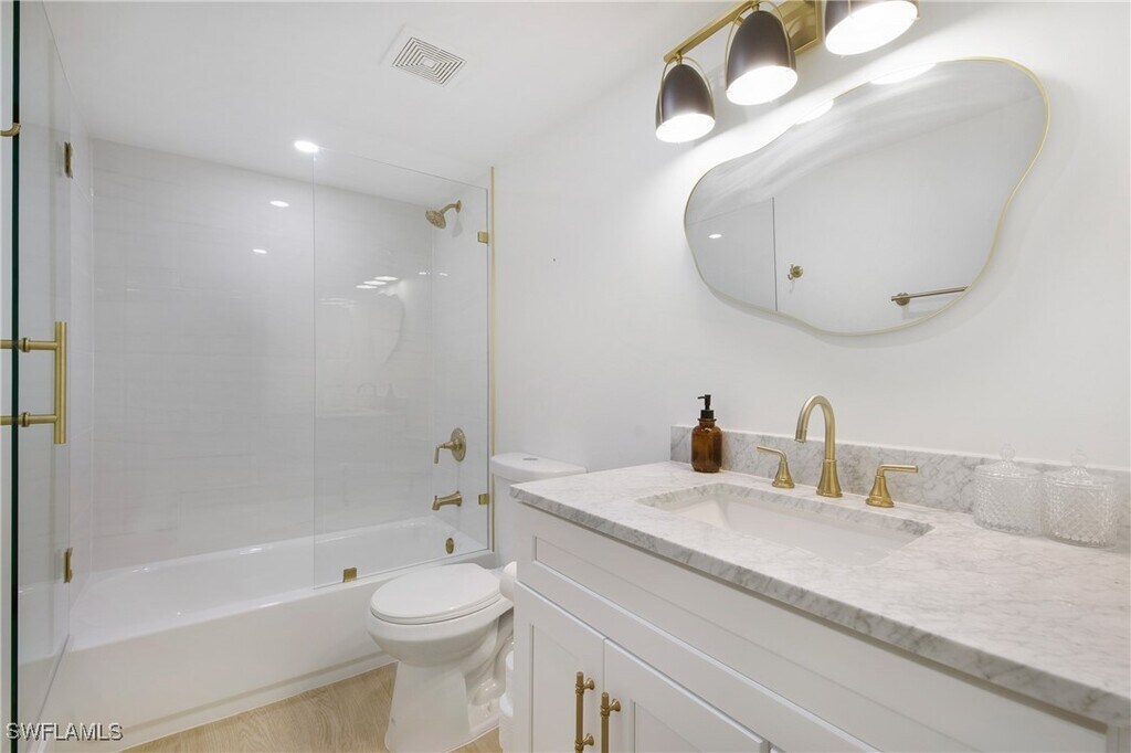 This charming,first floor 2 bedroom/2 bathroom condo is the perfect short or long term rental for simple,modern living. Completely renovated,this home boasts an open layout illuminated by natural light,new laminate wood floors and upgrades galore. This home features a spacious living area with brand new furniture,appliances and television,or effortless,turnkey living. Primary bedroom features a new King sized bed,spacious closet and en suite bathroom with shower. Second bedroom has two new Full sized beds and large closet. Second bathroom offers a brand new shower and bathtub. Private landscaped views from living and kitchen area can be enjoyed inside or outside on the enclosed lanai,which is perfect for opening up for fresh air or leaving closed while enjoying a good book or cup of coffee. Washer and dryer are conveniently located in residence,as well as additional storage unit outside,great for bikes and beach chairs! Royal Bay Villas is centrally located in Naples highly sought Royal Harbor area. Minutes from downtown Naples,shopping,dining and entertainment,as well as spectacular Naples beaches! Community pool and tennis courts are available for tenants to use throughout their stay. Don't miss this opportunity to savor a piece of paradise in this one of a kind home!