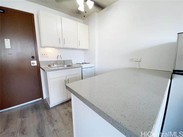 To view details or schedule a showing on this, or any of our listings, please visit: Cozy end unit studio with assigned, covered garage parking spot in Kapiolani Terrace. 369 square feet of living space with some furnishings provided (see pictures). The unit comes with a refrigerator, oven, cooktop, and microwave. Rent includes water and sewer. Tenant is responsible for all other utilities. Kapiolani Terrace is centrally located near Ala Moana Shopping Center, Waikiki, Convention Center, Walmart, Don Quijote, multiple restaurants, entertainment venues, public transportation and more. Building amenities include community laundry facilities, swimming pool, BBQ area, on-site manager, and trash chutes. Initial lease term of 1 year. No pets/no smoking unit. $1650.00 per month/$30 application fee. Amenities: Pool, BBQ Grill Area, On-Site Manager, Community Laundry