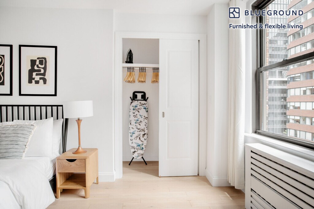 Feel at home wherever you choose to live with Blueground. You’ll love this sophisticated Midtown East furnished one bedroom apartment with its modern decor, fully equipped kitchen, and spacious living room with great views. Ideally located, you’re close to all the best that New York has to offer! (ID #NYC1170) The advertised rate of $6,710/month is the lowest available price, based on a 11 month(s) and 29 day(s) stay with a move-in date of January 23, 2026. Rates vary depending on the duration of stay, season, and other parameters. For exact pricing and additional pricing components, please visit our website and enter your desired move-in and move-out dates. The rate is applicable when billed upfront; it can be higher if billed in multiple payments. Brokers are welcome to reach out. Were you looking for an unfurnished lease? Try Blueground instead and upgrade from unfurnished to furnished living: - Furnished at rates comparable to unfurnished - No setup or furniture costs - save thousands - Move-in ready - save time, just bring your suitcase Designed with you in mind As with any Blueground apartment, you’ll find a thoughtfully designed space complete with beautiful furniture and a fully equipped kitchen in this one bedroom property. And, thanks to our superior quality mattresses, luxury linens, and towels, you can relax knowing you’ll always feel comfortably at home. When you’re ready for some fun, you can take in the New York vibes or bring the entertainment to you with the premium wireless speaker or smart TV. This apartment also offers in-apartment laundry. Sleeping arrangements Queen Bed, 63in/160cm Amenities Building amenities unique to this one bedroom apartment include an on-site: - Doorman - Dryer - Elevator - Washing machine - Pets allowed Arrival and ongoing support The entire apartment is yours to enjoy! Throughout your stay, you’ll have access to our Client Experience team through the Blueground App. You can schedule additional cleanings, submit maintenance requests, and view our neighborhood recommendations with just a few taps. We’ll share all details upon confirmation of your stay. Ideally Located This furnished apartment is located in Midtown East. This bustling neighborhood is home to NYC landmarks like the Empire State Building, the United Nations' headquarters, and Grand Central Station. Midtown East is also home to a thriving dining scene, with everything from humble food carts selling hotdogs to white-tablecloth restaurants with multiple Michelin stars. There are also many cultural attractions, including the Museum of Modern Art, the lovely Japan Society, the historic Morgan Library, and more. Midtown East is also home to some incredible shopping, from the international flagship stores along Fifth Avenue to Bloomingdale's, one of the city's best-loved department stores. Other things to note Building amenities may have an extra cost. This Blueground apartment has flexible lease options, allowing you to book it for one month, a year, or more. Pets are welcome, though weight limits and breed restrictions apply and may incur fees. Brokes CYOF. We take great pride in ensuring every photo displayed is shot in our own units with our actual furnishings. That said, we regularly refresh our decor and furniture arrangement, which may differ from what’s pictured. [SI]