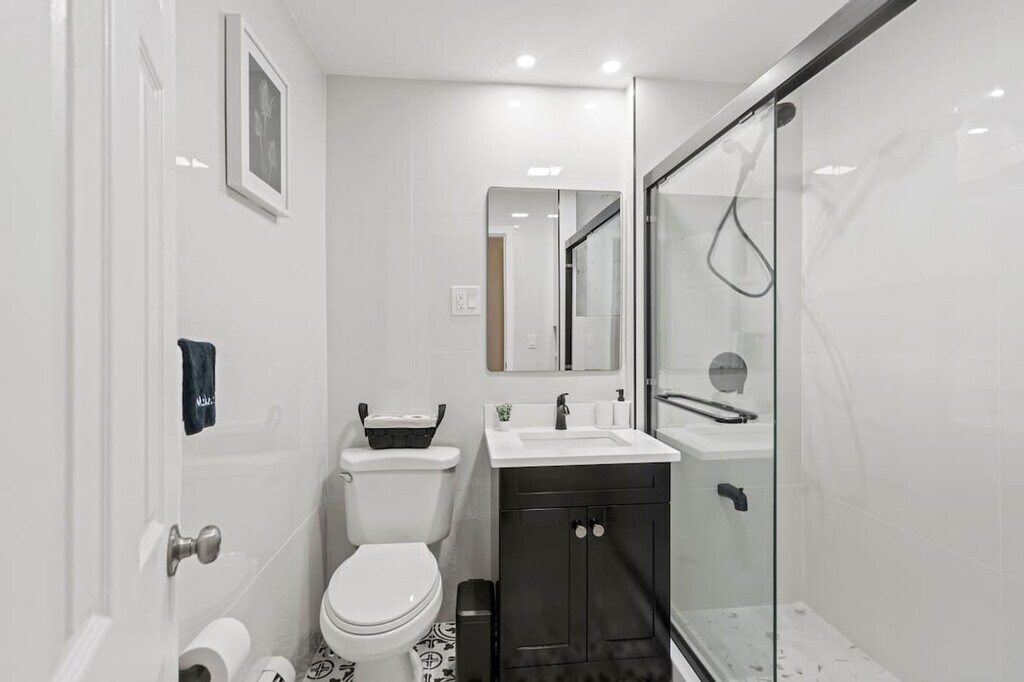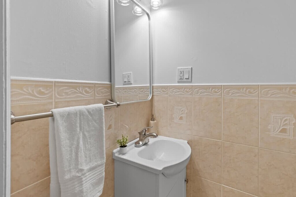 Feel at home in this sunlit 2-bedroom apartment, located on the 2nd floor, just 15–20 minutes from Times Square and 10 minutes from the FIFA World Cup 2026 at MetLife Stadium and American Dream Mall. This apartment is perfect for families, business travelers, or first-time NYC visitors. This apartment features a full kitchen, a 65” 4K smart TV with Netflix and Prime Video apps, and adjustable heating and dedicated A/C units upon request. The full kitchen is equipped with an oven, stove, microwave, fridge/freezer, coffee maker, and all the essentials needed to cook or enjoy takeout. Free gated parking is included. A full-size floor mattress is available on request. Centrally located in North Bergen, NJ, this apartment offers walkable access to groceries, dining, and transport. It's near Liberty Science Center, Medieval Times, and outlet shopping, and just a short distance from Times Square, MetLife Stadium, and American Dream Mall. The neighborhood is a safe residential block with police, fire, and hospital services within 1 mile. This apartment is located at an intersection, so some traffic noise may be noticeable. Quiet hours are observed between 10 PM and 7 AM, with a penalty of $50 after the 3rd warning. No parties, events, or large gatherings are allowed, with a $500 fine for violations. Smoking and vaping are prohibited indoors, with a $500 fine. No pets are allowed due to this being an allergy-sensitive space. Unauthorized late check-out will result in a charge of $25 per 30 minutes. There is a $50 security risk fee if the green gate or front door is left open. Extra vehicles are towed/fined $250 and unauthorized guests will be charged $50 per night. Includes high-speed Wi-Fi and an ergonomic work desk. [SI]