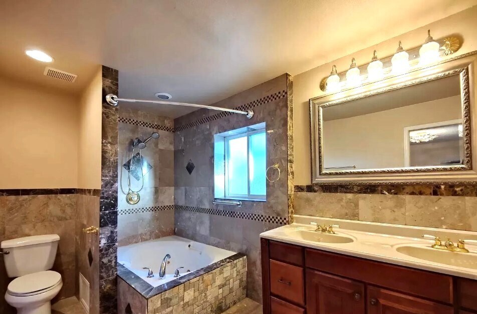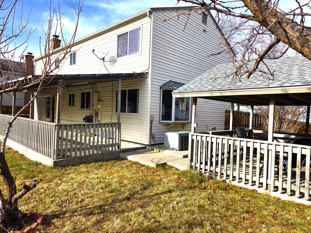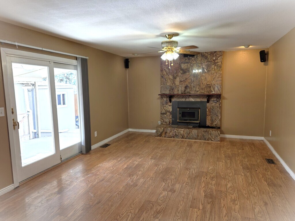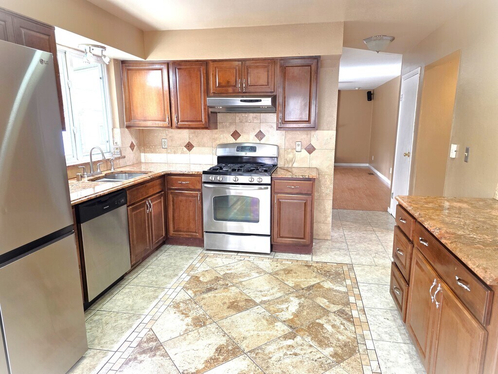This spacious unit offers exceptional room for entertaining and everyday living. The expansive living room welcomes you with hardwood floors and abundant natural light, flowing seamlessly into the dining area. The kitchen is beautifully appointed with granite countertops, stainless steel appliances, and ample cabinetry for storage. All bedrooms are located upstairs, including the oversized primary suite featuring a private en-suite bathroom with dual vanities, a whirlpool tub, and a walk-in closet. One of the additional bedrooms offers direct access to the shared bathroom for added convenience. The finished basement provides a wide-open layout perfect for gatherings, complete with a stunning wet bar with tile countertops. Additional storage and functionality can be found in the basement laundry room, which includes a washer and dryer. Off the kitchen, a cozy family room with a fireplace opens to a large backyard patio ideal for outdoor entertaining. The backyard has many features!!!!!