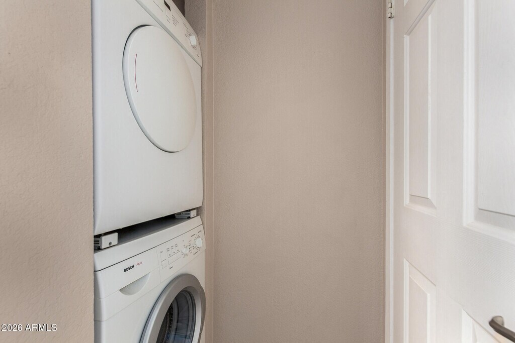 Welcome home to this inviting 2-bedroom! Inside,wood-look floors flow through a cozy living room,creating a warm and welcoming vibe. The kitchen is well-appointed with matching appliances,neutral cabinetry,ample counter space,and a breakfast bar perfect for casual meals. Unwind in the primary bedroom featuring a full bathroom and a walk-in closet,while the secondary bedroom offers direct access to the patio ideal for indoor-outdoor living. A stacked washer and dryer add everyday ease. Outside,relax on the covered patio with 2 handy storage rooms. Enjoy resort-style amenities including TWO community pools and spas and a community clubhouse all just minutes from a golf course,shopping,and local favorites. This is one you'll want to see in person!