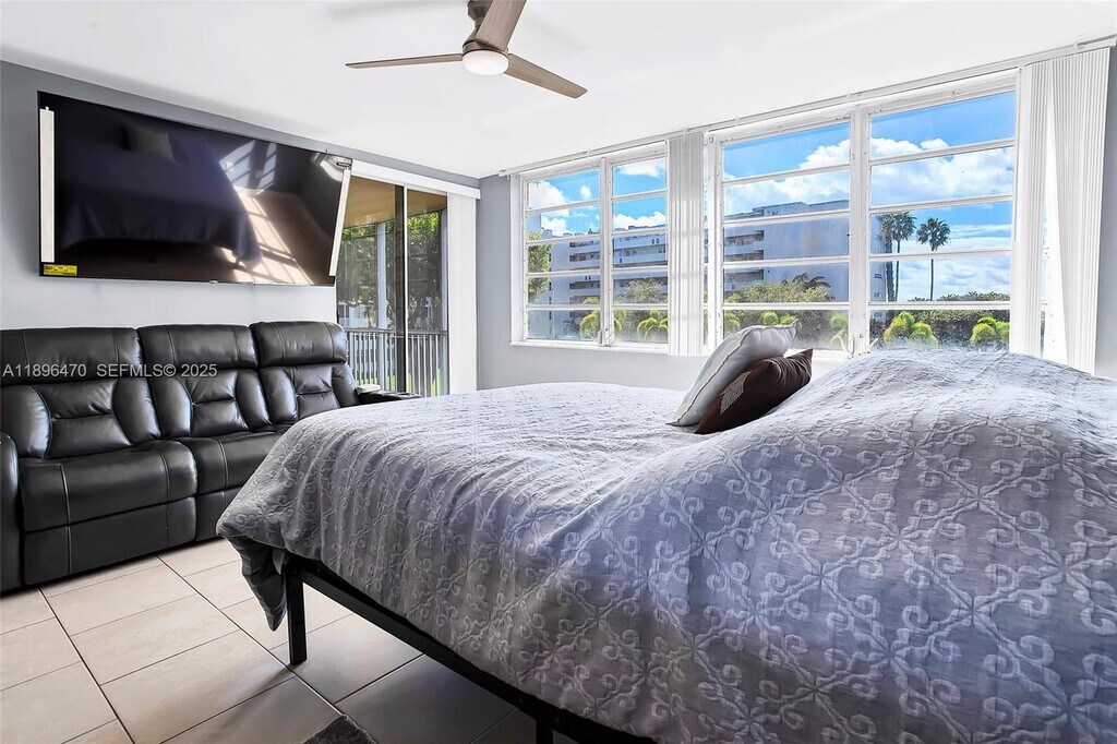 Beautifully renovated 2/2 with porcelain floors, new kitchen, new fridge and oven, updated lighting, no popcorn ceilings, and brand-new A/C. Bedrooms include new blackout curtains. Enjoy stunning views from the enclosed balcony with acrylic panels. Safe, well-maintained community with 24-hr security, gated entry, remodeled lobby and elevators, new pool, updated bathrooms, and sauna. Association is actively making continuous improvements. Move-in ready!