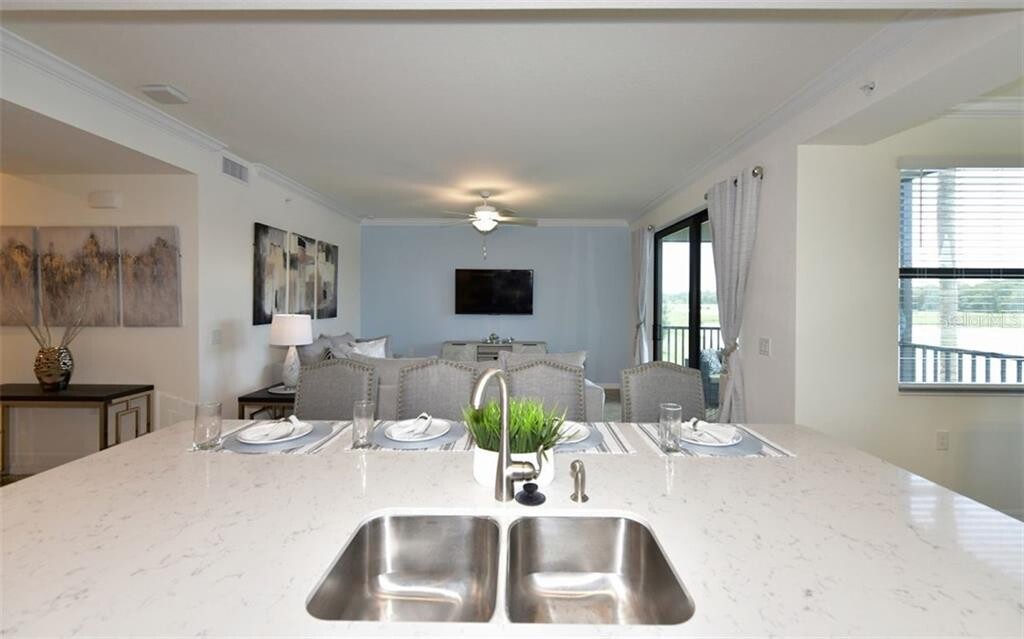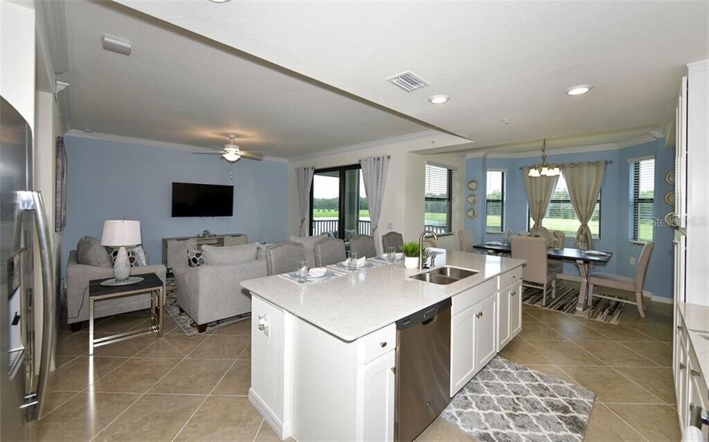 Gorgeous "Birkdale" second floor,2 bedroom,2 bathroom condo with lovely open and inviting floor plan! Condo has been decorated by professional interior designer with chic coastal furnishings. Enjoy stunning views as you enter the condo which boasts a large cook's kitchen with huge granite island for cooking and entertaining and new stainless steel appliances. Master ensuite bath has walk in tile shower. This open floor plan lends itself to Florida lifestyle living with gorgeous lake and golf course views from the kitchen,living room and lanai. Enjoy hours of entertainment as you entertain guests and watch the golfers navigate the new Arnold Palmer designed 36 hole golf course as the sun sets in the evening! Enjoy resort style living in Lakewood Ranch's newest golf Community! AMENITIES INCLUDE CLUBHOUSE WITH RESTAURANT AND TIKI BAR,FITNESS CENTER,RESORT STYLE SWIMMING POOLS WITH OUTDOOR GRILLE AND POOLSIDE SERVICE,A FULL SERVICE SPA,TENNIS,PICKLE BALL,BOCCE COURTS AND MORE! Membership transfer available. $65.00 monthly min. expenditure is required at the on-site Tiki Bar/Restaurant (Alcohol Excluded). Easy access to I-75,local shopping and dining,University Parkway,Sarasota Airport and all that Lakewood Ranch has to offer. * HIGH SEASON = DECEMBER through APRIL* OFF SEASON = MAY - NOVEMBER* MLS# A4465678