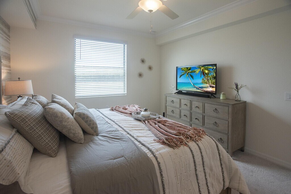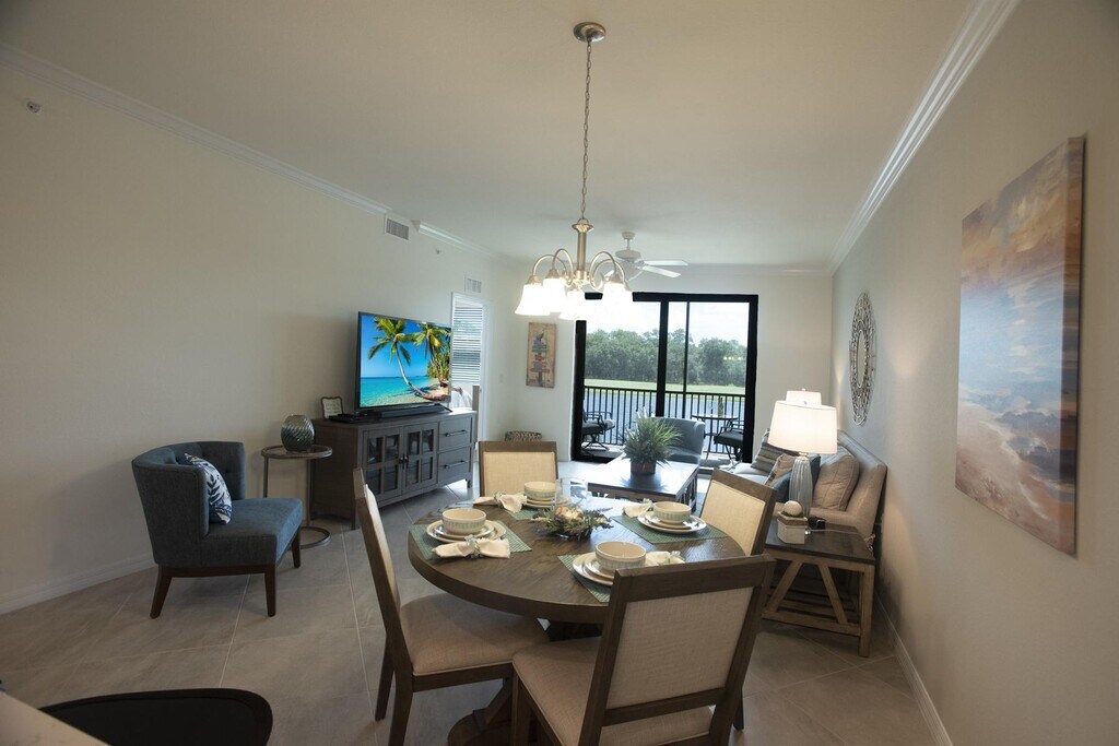 Welcome to this beautiful Condo named "Paradise Found" at Lakewood National Golf Club. Whether your definition of paradise is enjoying a wide variety of outdoor sports, power shopping at the huge selection of area malls and specialty boutiques, or sunning at our resort pool or our world renowned beaches, you can experience it all while staying at our NEW 2 bed/ 2 bath condominium overlooking a picturesque lake and one of Lakewood National’s TWO Arnold Palmer-designed championship golf courses. Golf – Our club membership is transferable to you for a fee to you during your stay. This golf course recently ranked as one of the Top 50 courses in all of the U.S. by Golf Advisor and the #3 public accessible course in all of Florida!) Fittingly, it’s also home to the PGA Korn Ferry Tour LeCom Classic pro tournament each year. Recreation – 8 lighted Har-Tru tennis courts, two pickleball courts, a bocce ball court, a 24-hour professionally equipped fitness facility with full-time trainer and activities director, locker rooms, and a relaxing full-service Utopia Spa for pampering afterwards. Shopping – Enjoy St. Armands Circle with its plethora of boutiques, Lakewood Ranch’s University Town Center Mall, the Ellington Premium Outlet Mall, or the multitude of shops in each of the 20+ villages throughout Lakewood Ranch. Explore any of Sarasota’s nationally recognized white sand beaches only 30 minutes away - Lido Beach, Longboat Key, Anna Maria Island, and, of course, #1 rated Siesta Key Beach! Closer to home, experience the good life sunning by the zero-entry resort pool surrounded by palm trees and waterfalls, all while sipping a cool drink from the nearby Tiki Bar. Home in Paradise – Did I mention it’s BRAND NEW? You’ll surely enjoy our coastal-style condo, fully outfitted with everything you need for a relaxing visit. Enter into a luxurious kitchen with all white cabinets, marble-look quartz counters, and stainless steel appliances. Just beyond, the nicely appointed dining room and living room (with 65” 4K Smart TV) are open to the kitchen so you have a fantastic view to the lake and part of the golf course, not to mention the screened-in lanai seating area, which is great for relaxing anytime. The Master bedroom has its own view of the lake and golf course, and is outfitted with a king size, hotel-quality mattress, 50” 4K Smart TV, two walk-in closets and an en-suite bath complete with quartz counter tops and a large walk-in tiled shower. The Guest bedroom is outfitted with a queen bed, nightstands and a separate dresser to store your personal belongings. (A rollaway bed is also on hand for that extra 5th guest.) Need a tub? The second full bath (next to the guest bedroom) has a tub/shower combo, and includes the very convenient in-unit, full sized washer and dryer set. There will be a transfer fee of $642.00 if the guests want to have all the amenities transferred which will include a golf membership to you, for the entire length of their stay. There is a charge per round per person of $75 for 18 holes and $45 for 9 holes each time you want to play. Prices are subject to change. Availability Strating April 1st - December 2026 for Long Term January 1st -March 31st, 2026, has been reserved & booked!!