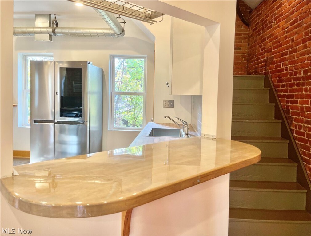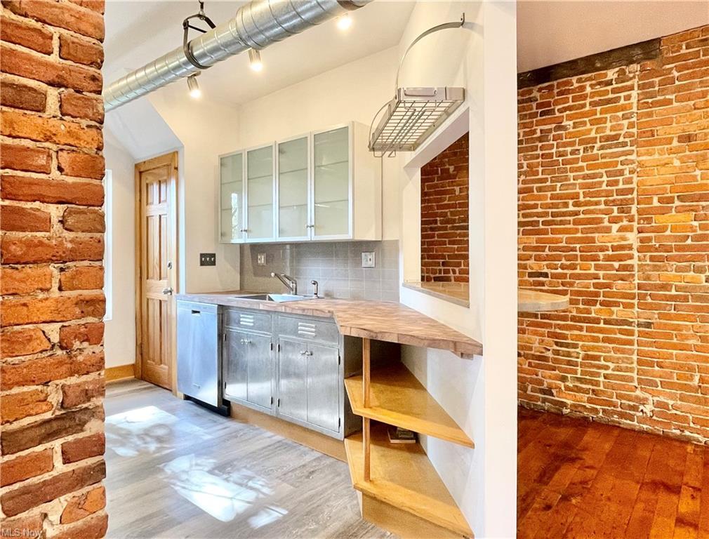 Fabulous studio historic carriage house in Ohio City, with all exposed brick walls, cool vintage stainless kitchen, hardwood floors throughout, slate and marble bath with stainless steel tub surround, central air, off-street parking, glass block window, free laundry, etc. Owner pays water/sewer/trash, tenant pays gas, electric, internet.