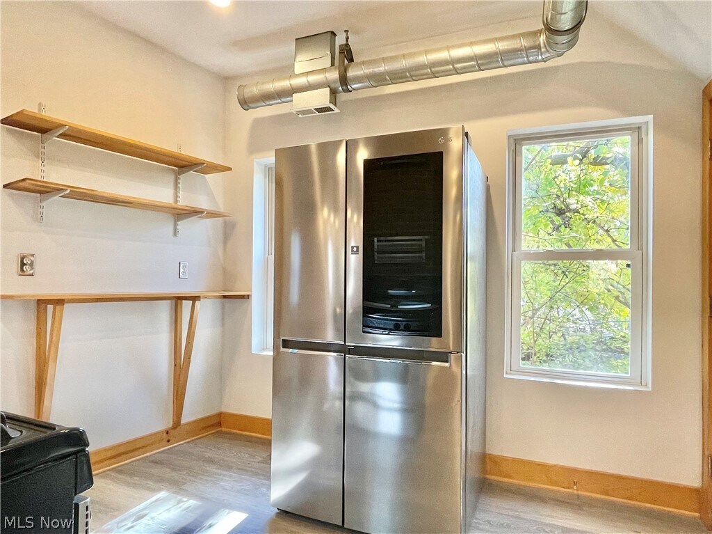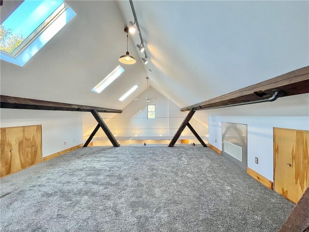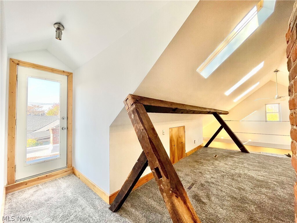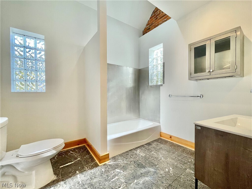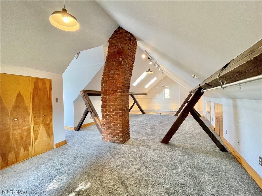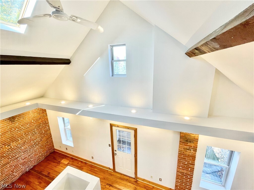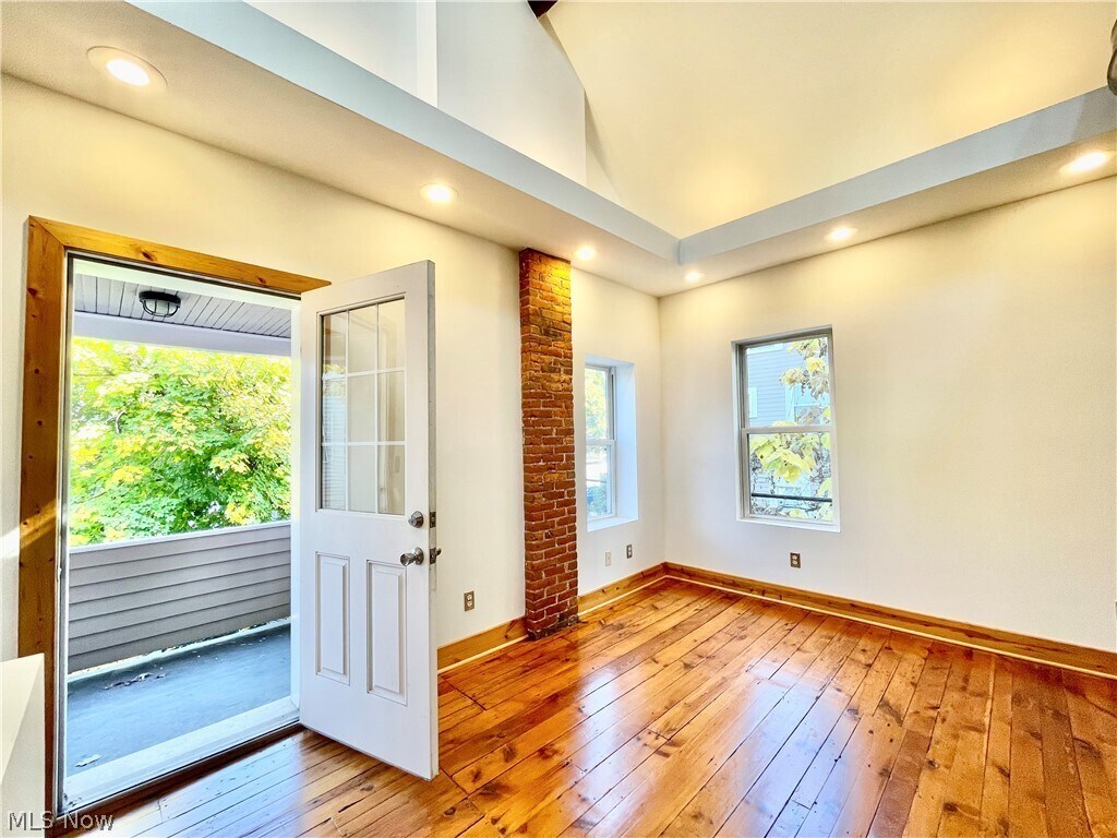 Newly remoded, dramatically lofted second floor unit with a huge two-story living space. Loads of windows that pour in natural light, all between full walls of exposed turn of the century masonry. A very cool kitchen with re-fitted industrial steel cabinets. Every inch in high-style industrial chic. A story and a half bathroom with a skylight at the top of the ceiling, and walls of stainless steel around the tub. A balcony opens off the great room, facing the courtyard. And a big lofted master bedroom with an artist's array of sloping walls and ceilings, spectacularly lighted, opens onto a big roof deck overlooking the whole neighborhood. Artisan woodwork and fittings, vintage fixtures. Includes dedicated parking spot. An awesome location - just blocks away from Gordon Square restaurants and theaters, Hingetown only a few blocks to the east, and the heart of Ohio City a half mile away. Pets welcome.**Apartment available to include all furniture for additional $100/month.**