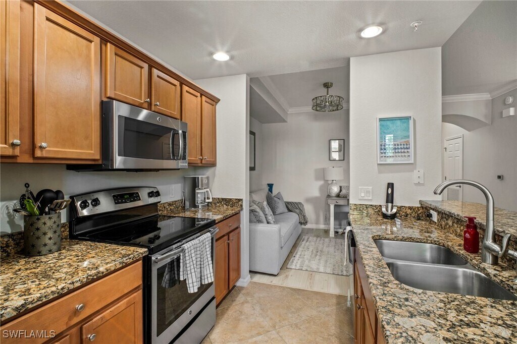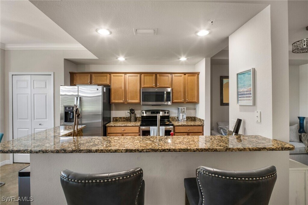 *Golf Membership* This 4th floor Bellini Terrace Condo offers 2 bedrooms and 2 bathrooms. Stainless steel appliances,granite countertops,crown molding,& 20" Porcelain tile on the diagonal are featured in this beautiful property. Bonita National is an extremely active & social community and one you’ll want to call your home away from home! This wonderful resort lifestyle includes a little something for everyone! Hang out with friends,new & old by the resort style pool & cabana or enjoy a glass of wine & dinner in the state-of-the-art club house. Relax & pamper yourself in the spa,workout in the fully equipped fitness center,or unwind in a yoga class. Saty Active on one of the eight Har-Tru surface Tennis courts or grab your clubs and play 18 holes of Golf! The course features an amazing aqua driving range! Nestled between Naples & Fort Myers a short drive in either direction will take you to sun drenched beaches,exclusive shopping & dining! Transfer fees and golf cart/green fees applicable.