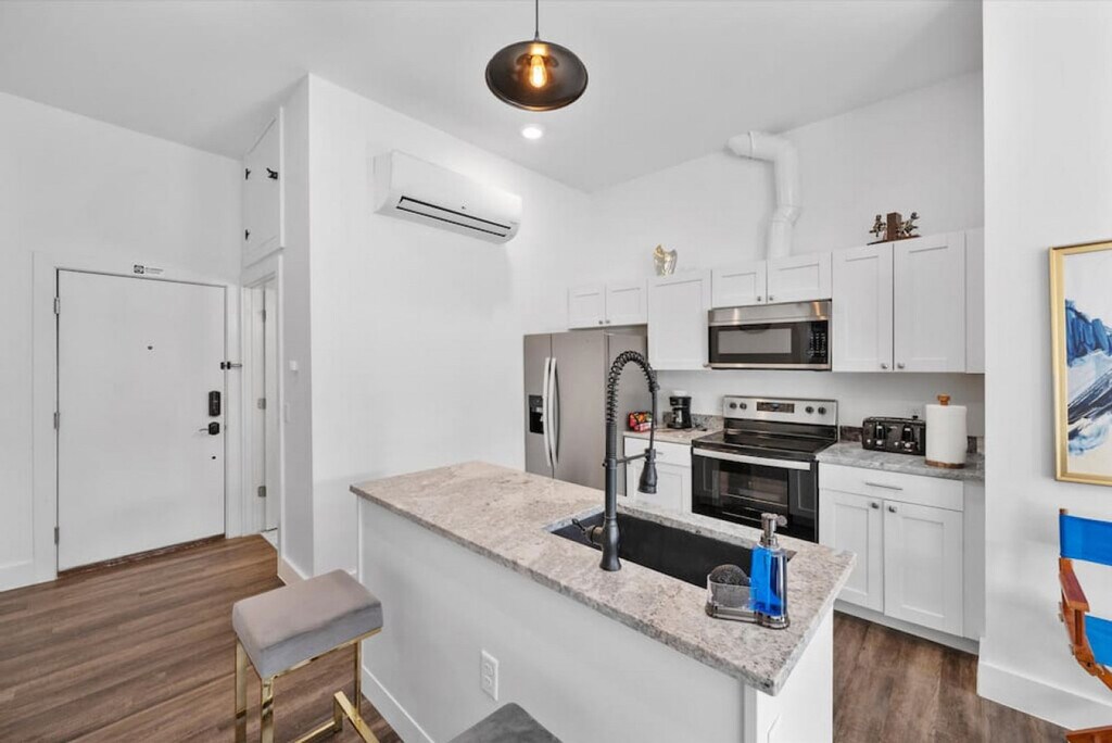 Nestled directly on Findlay Market in the heart of Over the Rhine (OTR), this newly remodeled loft-style condo offers a fantastic opportunity to feel at home in Cincinnati. Just steps away from some of the city's best restaurants, breweries, shops, and theaters, this condo provides easy access to all downtown attractions. Enjoy the convenience of being less than a 1-minute walk to the nearest free streetcar stop, offering seamless connectivity to the entire downtown area and stadiums. The condo boasts a brand new kitchen, open kitchen/living area, stainless steel appliances, and central air/heat to keep you comfortable year-round. The kitchen is fully equipped with everything you need to cook a delicious meal, making it easy to enjoy home-cooked meals during your stay. The open kitchen and living area provide a welcoming space to relax and unwind. Located in a vibrant neighborhood known as Cincinnati's downtown, food, and nightlife destination, Over the Rhine offers an array of bars, restaurants, boutiques, and pubs. The area is well-connected with electronic scooters nearby and a free streetcar stop just a minute from your doorstep. Enjoy proximity to Findlay Market, the new FC Cincinnati Stadium, Cincinnati Ballet, Opera, Music Hall, Washington Park, and Rhinegeist Brewery. With easy access to the University of Cincinnati, Cincinnati Bengals Paul Brown Stadium, Fountain Square, and more, you'll have plenty to explore. The neighborhood is a mixed-income, urban area with a diverse community, offering a unique blend of well-appointed condos and low-income housing. Quiet hours are from 9:30pm to 8am, and amplified music is strictly forbidden without advance written consent. Smoking or lighting anything indoors is not allowed, and violations may result in a $300 cleaning fee. Unauthorized parties are considered criminal trespassing under Ohio Revised Code and Cincinnati municipal code, and may lead to prosecution. Dishonest or abusive behavior will result in reservation termination without refund. A $170 re-keying fee applies for unreturned keys, and additional fees may be incurred for excessive cleaning or security issues. [SI]