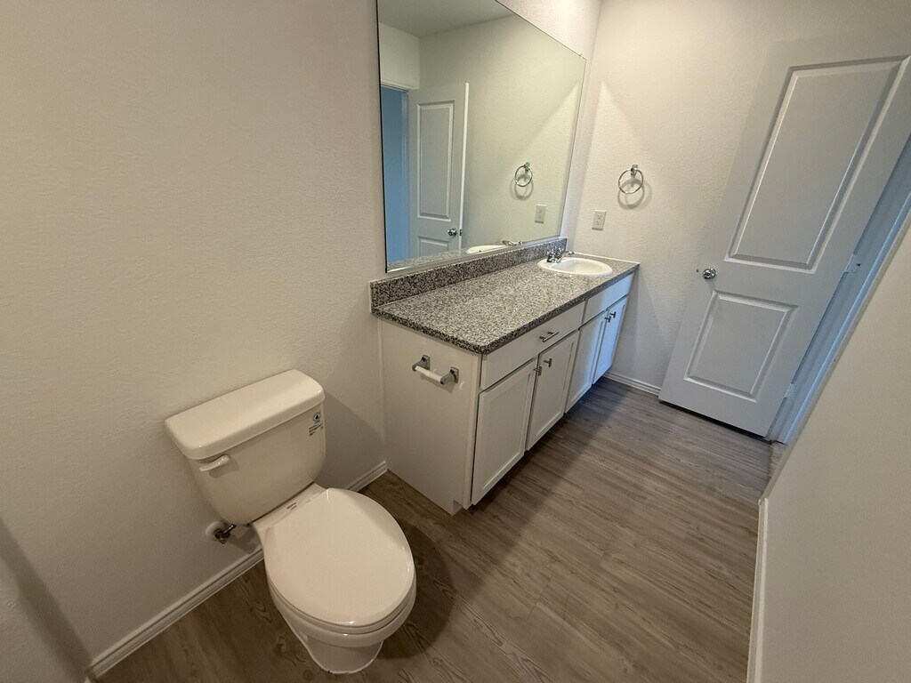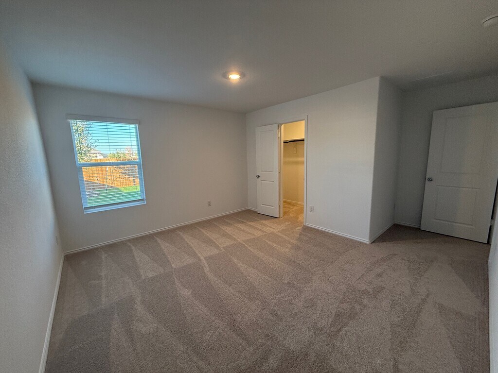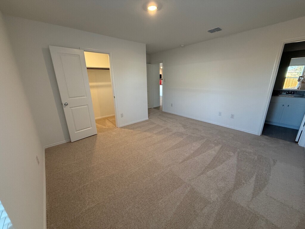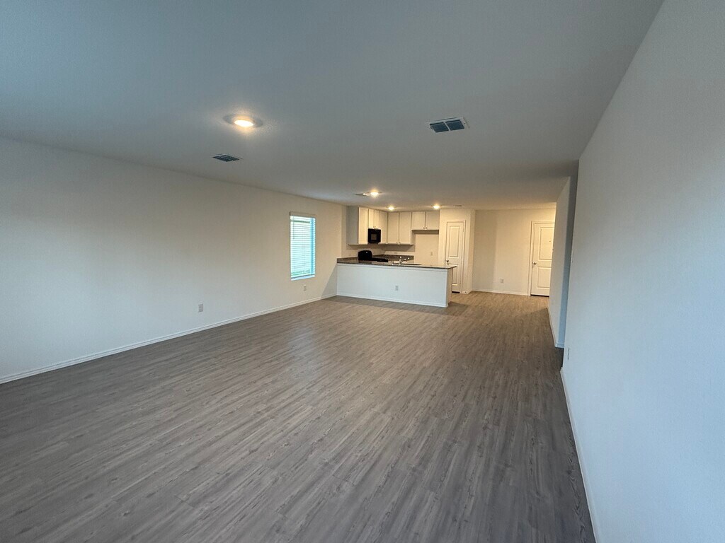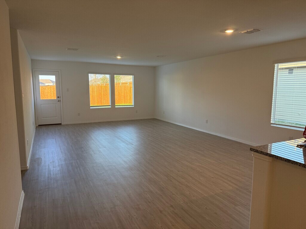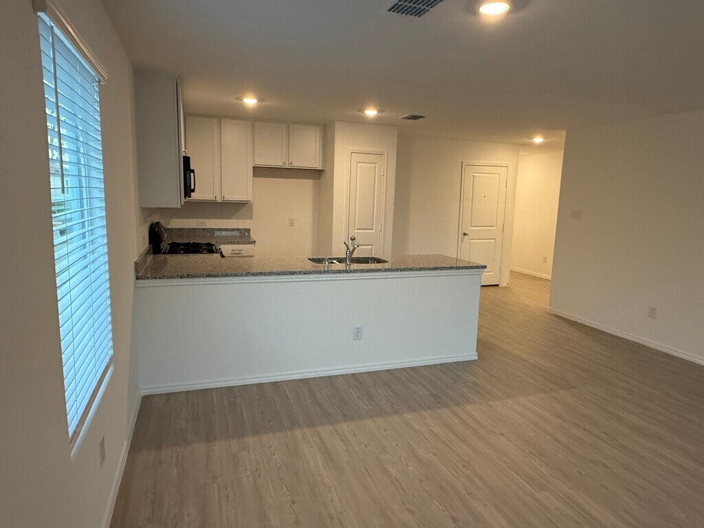 Single-story three bedroom home with open-plan living area made up by the kitchen, dining room and family room. Owner's suite with private bathroom and walk-in closet sits in the rear of the house. Kitchen has white Shaker cabinets with stunning contemporary hardware that compliment the black and white Granite counter top and backsplash. Contemporary Light Grey color Vinyl Plank flooring throughout the home. Carpet in the bedrooms and large laundry space. The large backyard is great for entertaining or a play area. Plenty of walking trails, playgrounds and a lazy river swimming pool. Close to 121 and 75. New HEB, Buc-ees and Costco very near by. A must see, beautiful inside house.