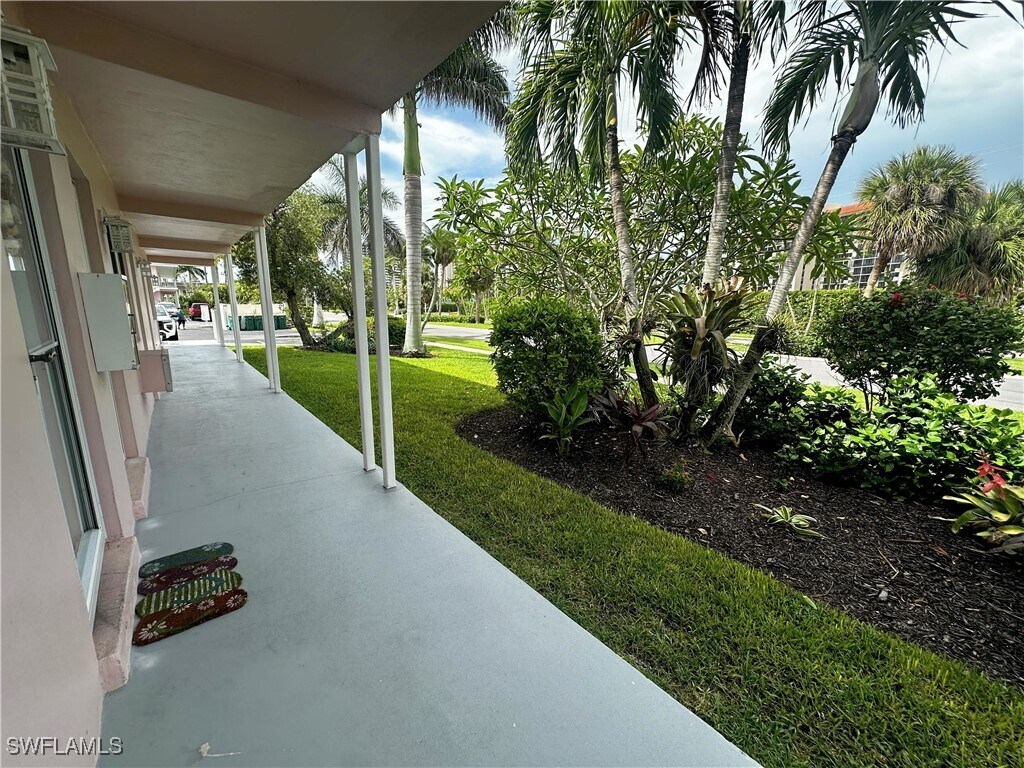 TURNKEY FURNISHED,LUXURY,Studio Condo...Centrally located on Marco Island.Available SEPTEMBER 15-2025 This ground floor unit has beautiful luxury vinyl flooring,crown molding,storage unit,small heater and FRESH PAINT. The living room has an oversized fan and a pull out couch with a top cushion that is memory foam for your guests. Nicely update kitchen has glass backsplash,white cabinets,breakfast bar,stainless appliances,Bosch dishwasher,Master suite has a queen size bed,room darkening shades and the en-suite has a tile shower,glass backsplash,white vanity with solid sink. Community offers oversized sparkling heated pool,clubhouse,shuffleboard,assigned parking,guest parking,laundry facility,extra storage and BBQ area. Walking distance to restaurants,clubs and more.