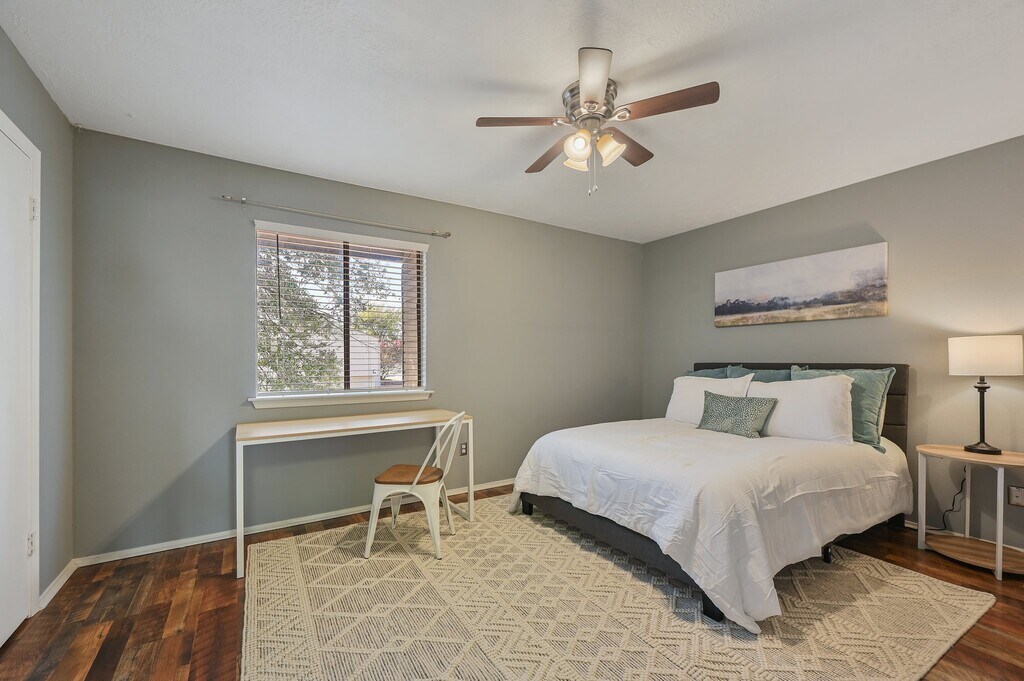 This is the perfect mid-term rental - it is centrally located to several medical centers, Texas A&M University, area attractions, shopping, grocery stores, service-oriented businesses, and restaurants. The unit is in close proximity to the pool and hot tub but still private and quiet. The unit features a shaded patio with chairs/table, in-unit washer/dryer, fully furnished with kitchen/bathroom essentials, one bedroom with a king-size bed and desk and second bedroom with a queen-size bed and covered porch. The unit also features one full bath and a half-bath for guests. Additional amenities include: Smart TV, utilities included (including WiFi), starter essentials such as cleaning supplies, soaps, TP, paper towels, ample parking close to unit, monthly cleaning service, and much more to make your mid-term stay comfortable and enjoyable. Video & Matterport 3D walk-thru available upon request.