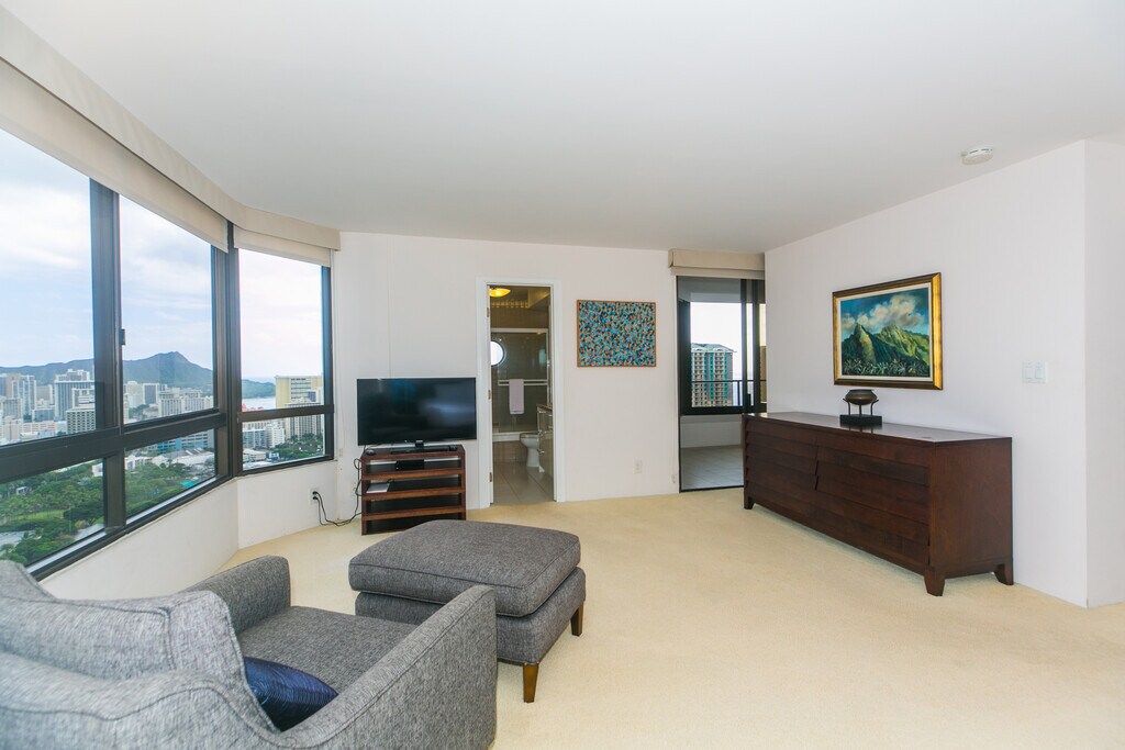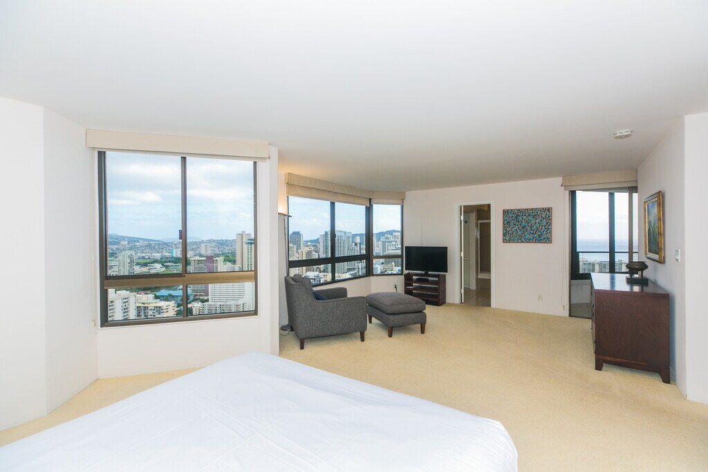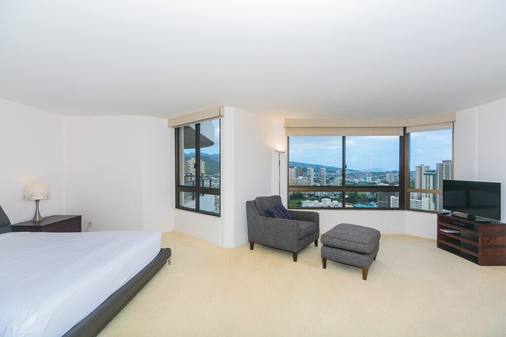 Fully furnished 1270 sf distributed over 2 master bedrooms, kitchen, living and dining rooms, with and additional 280 sf wraparound lanai as we call our balconies, across from Ft. DeRussy park and Hilton. With some of the most stunning views on Oahu's south shore, Unit 18-A of Canterbury Place is sure to enchant you with one glance. Gorgeous views of the ocean, Fort DeRussy Park, Waikiki, Honolulu skyline, and Diamond Head can be seen from almost every vantage point in the unit. Fully furnished and decorated, this place offers all the comforts for you pleasant stay in Waikiki. Floor to ceiling sliding glass doors that open to a spacious lanai allow residents to enjoy the soft trade wind breezes and smell the fresh, sea air. Lounge in the sun on the lanai or gaze at the ocean from the cozy couch, your true vacation destination awaits. The prestigious Canterbury Place offers premium security features including: locked lobby doors, 24-hour private security services, and an intercom device, so that safety and comfort are never an issue. Concrete walls allow residents to enjoy a noise level of their own preference without disturbing or being disturbed by other residents. For continued relaxation, Canterbury Place offers amenities such as: a heated pool, Jacuzzi, dry sauna, gas powered barbecue station, library, meeting room, lawn chairs for sun bathing, and a small tennis court. Due to ongoing building renovations, some of these facilities might be temporarily closed. Walking distance to all...beach, shops, restaurants, Ala Moana Mall. Watch the every Friday Hilton fireworks from your lanai! 24 hr. security. WiFi/HDTV, electricity and A/C are of course included. All that at: $6500/month is a pretty good deal in our luxury building with 24 hour security. 17.962% Taxes per mo. for stays under 6 months. Taxes will increase in 2026. Final cleaning will be $500. A 30-day minimum stay is required. Max 3 people, each additional person is $20/day extra. Each small, clean, quiet, well behaved pet is $20/day extra and has to obey to the Condo rules. Single days are prorated at full monthly rate/30. Parking is available for $7/day plus tax. LEASE TERMS Tenants must have good credit. No Smoking. Electricity, Water, Sewer, Basic Cable and building amenities are included. High season: December 1st to April 15 and June 15th to September 30th. Low season: The rest of the time LEASE TERMS Electricity, Water, Sewer, Basic Cable and building amenities are included. No Smoking in the Condo or the building.