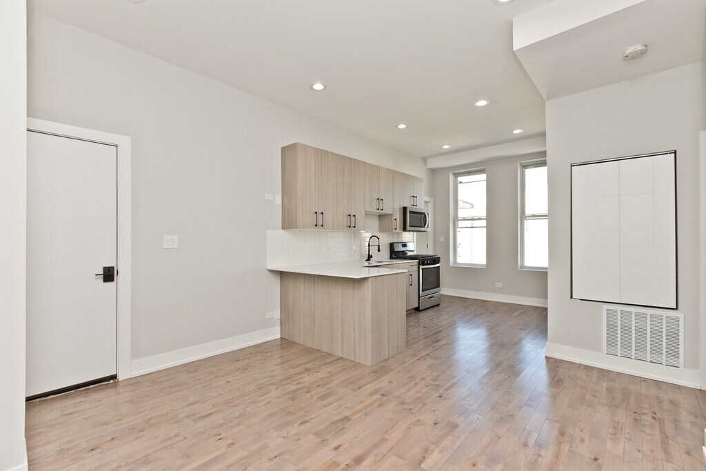 Renovated apartment in a beautiful vintage building on a quiet residential street in Pilsen. Condo grade quality appointments include quartz countertops, stainless steel appliances, and new hardwood floors. Eat in kitchen counter island open to living area for convenient entertaining. Full size washer/dryer in unit, bathroom has vanity mirror and push button toilet. Numerous restaurants a short walk away and a city park down the block. Presented by Fulton Grace Chicago IL