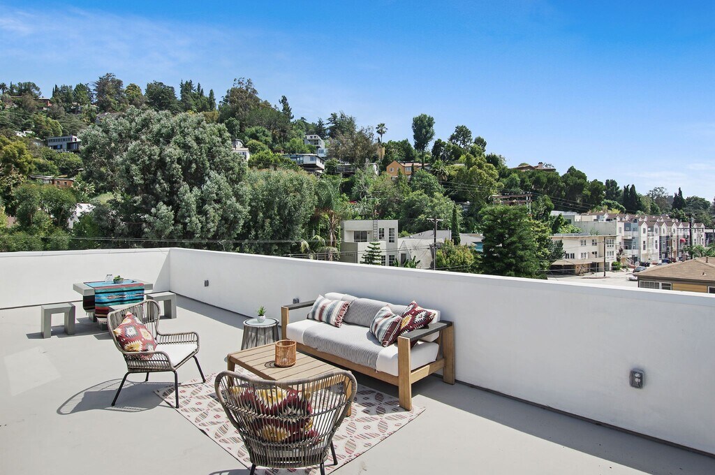 Modern Silver Lake single-family home with a roof deck & private back yard! Enter into the foyer or from the two-car garage with direct access. 1st floor offers a bedroom with en suite bath. Head up to the dramatic living room with oak floors, open to the dining room & kitchen. The gourmet kitchen has quartz counters & stainless Bosch appliances. A full wall accordion door opens off of the dining area to enjoy true indoor/outdoor living. The 3rd floor offers a primary bedroom suite with a huge walk-in closet & en-suite bath with double sinks & an oversized shower. There is another bedroom on the 3rd floor with an en-suite bath. The spectacular rooftop deck with unobstructed views westward - perfect for a glass of wine at sunset! Central A/C with a thermostat on each floor as well as a stackable laundry next to the primary. Access to transportation & downtown LA. Stone's throw to Casita del Campo, Hyperion Public Bar, Lyric Theater, Hype Yoga Studio & Gelsons. Top-rated Franklin Elementary and Thomas King Middle! MLS# 25618863