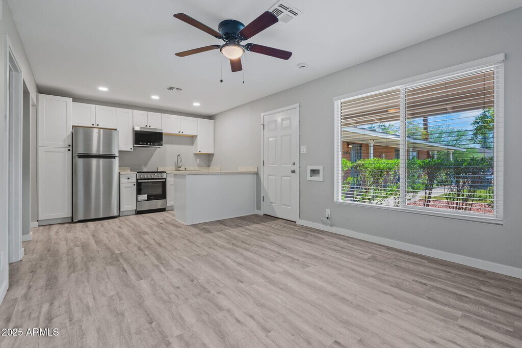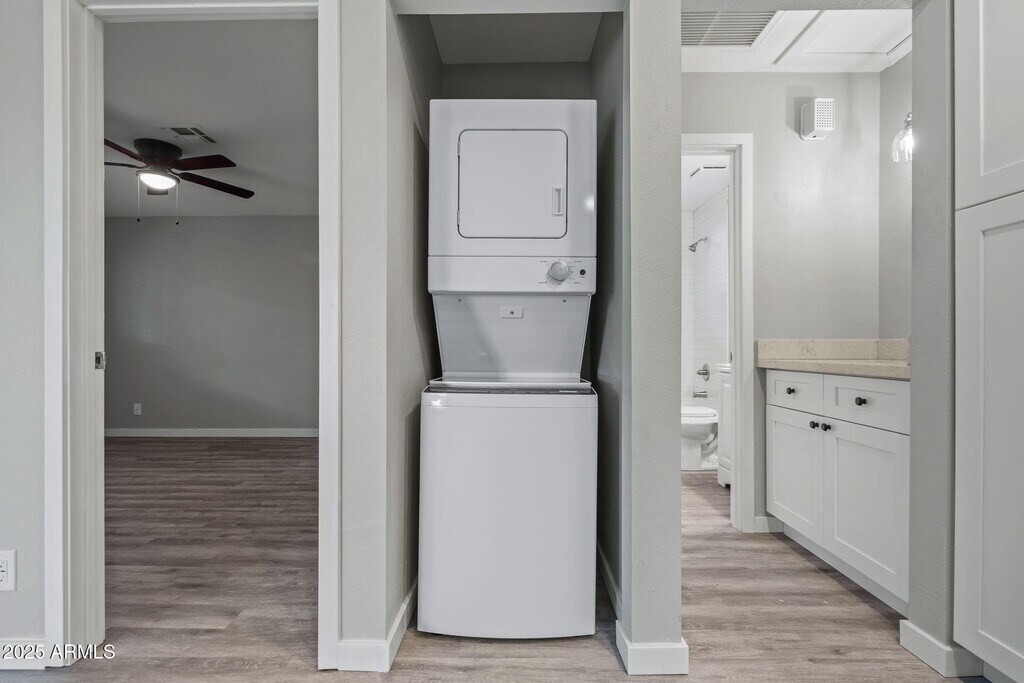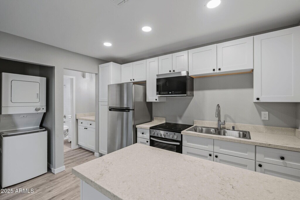 Totally renovated and is ready for someone new to make it home! The spacious living room flows right into a modern kitchen with stainless steel fridge,range,and microwave. You'll love the large bedroom with a beautiful walk-in closet plenty of room for all your things. Vinyl flooring runs throughout,making it both stylish and easy to clean. No laundromats here you've got your own stackable washer and dryer. Plus,one covered parking space is included! Lets talk about location! Right at 19th Ave & Indian School Rd,you're just minutes from the light rail,which makes commuting a breeze. Downtown Phoenix,Grand Canyon University,Encanto Park & Golf Course,and tons of shopping,dining,and entertainment are all nearby. Central Phoenix