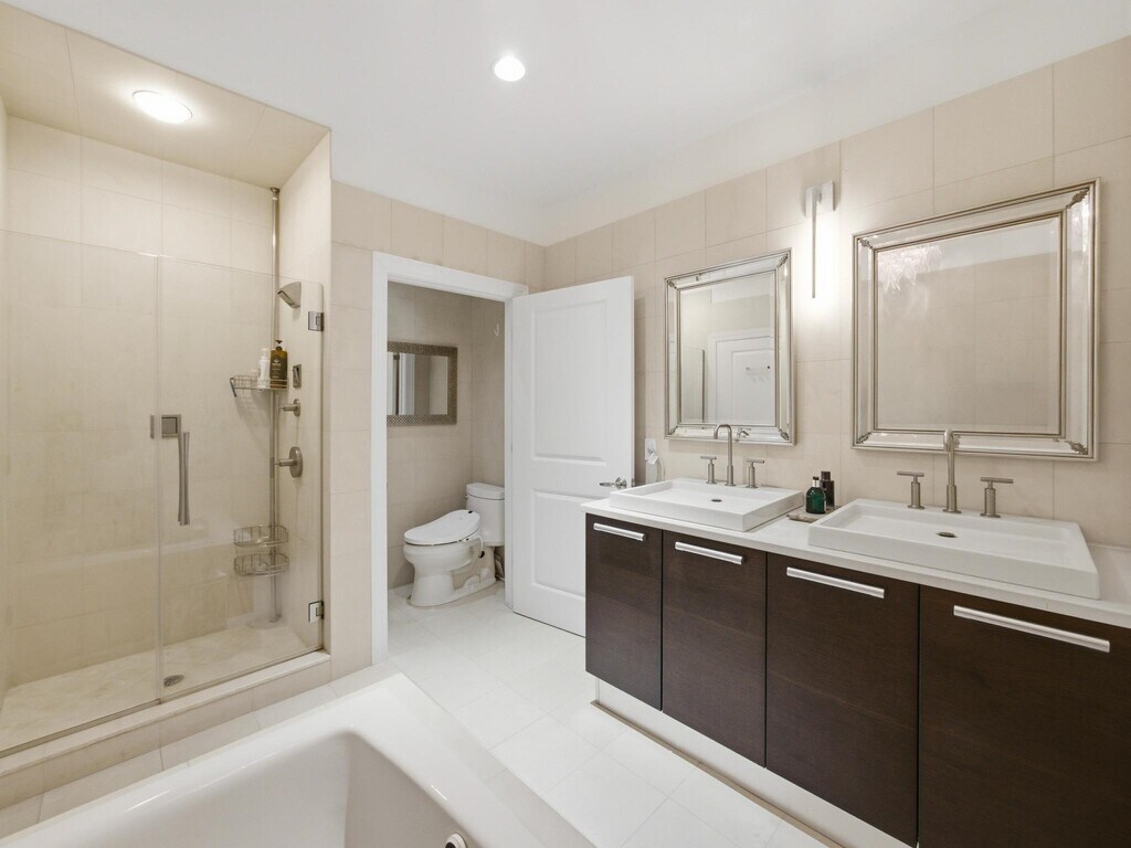 This stunning 1-bedroom, 1-bath condo features soaring 9-foot ceilings, enhancing its spacious and airy feel. The chefs kitchen is equipped with 42-inch cherry cabinets, granite countertops, stainless steel Viking appliances, and a SubZero refrigerator. The inviting living room boasts a beautiful bay window, hardwood floors, and elegant custom paint. The luxurious master bath offers dual sinks, a jacuzzi-style soaking tub, and a separate stand-up shower. A newer Samsung washer and dryer add convenience. Enjoy top-tier amenities, including a 24-hour concierge, fitness center, clubroom lounge, business center, and an outdoor swimming pool with a shared courtyard featuring breathtaking NYC skyline view.