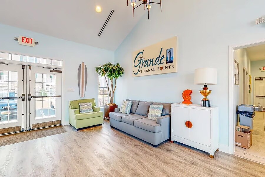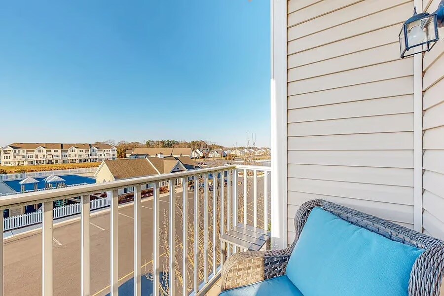 Admire the pool from your sunny balcony at this fully furnished, top-floor, end unit, luxury condominium, with no neighbors above. You'll love the friendly, well maintained popular beach community of The Grande at Canal Pointe! Inside, youll find a sun-filled layout that's light, airy, and open. Whip up delicious dishes in the sparkling full kitchen, configured with generous counter space and stainless steel appliances. Kick back beneath cathedral ceilings in the living area or unwind in the plush primary suite. Thoughtful perks like a private washer/dryer, WiFi, Smart TV, and central AC add to your comfort. Enjoy single-level living, no steps or staircases, with wide interior doorways, hallways, and hardwood floors throughout. The building has an elevator for your convenience. The community also has a large, outdoor/seasonal in-ground pool with lounge chairs and umbrellas, along with a clubhouse and gym for guest use. Ideally located, this condo complex is east of Rt 1 with access to the outlets on Coastal Hwy or a quick walk, cycle, or drive into downtown Rehoboth Beach, where you will find many restaurants, shops, a boardwalk, and the beach. If you enjoy walking or biking, the Breakwater Trail is just 1/3 of a mile from the condo! Perfect location for traveling health care professionals and those relocating to the beach area.
