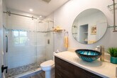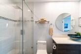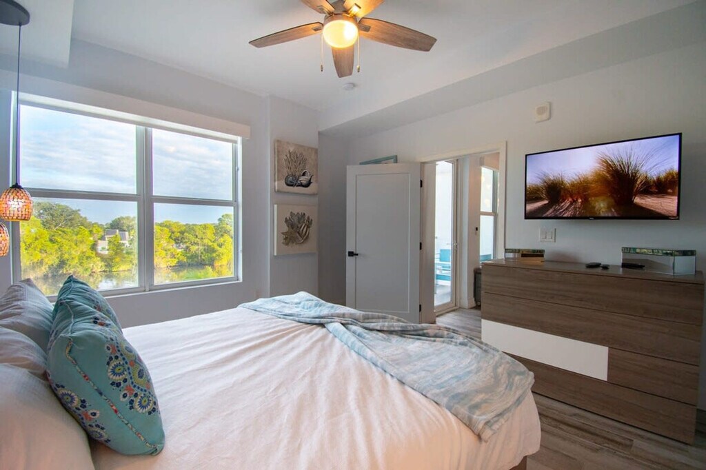 Welcome to our Waterfront Stateroom, a 3-bedroom unit adorned with modern furnishings and an expansive open-plan living area. This apartment features a fully equipped kitchen and a north-facing glass balcony that offers unparalleled views of the canal, rocket launches, and dolphin sightings. Enjoy the convenience of a washer/dryer and a queen sleeper sofa. Step inside this spacious and tastefully decorated condo, boasting modern amenities and breathtaking views. The open concept living area features ample seating, perfect for relaxing or entertaining. Prepare meals in the fully equipped kitchen and enjoy them in the elegant dining area or al fresco on the private balcony overlooking the marina. The master bedroom is a true oasis, offering a plush king-sized bed, a large wardrobe, and an en-suite bathroom. The second and third bedrooms are equally inviting, each with comfortable queen-sized beds and plenty of storage space. The shared bathroom is spacious and features a walk-in shower. Resort-like amenities include an inviting pool, a spacious deck, and a fully equipped gym. The marina offers convenient boat rentals for exploring the stunning coastline. Plenty of space for on-site parking at the unit plus a one-car garage. Only dogs are allowed at this property with a fee of $100 per pet per stay. Located on Merritt Island, Florida, Cape Crossing is a waterfront “Old-Florida Keys” style resort where vacationers and corporate travelers can enjoy a fun-filled Florida adventure with all the comforts of home. Dolphins Waterfront Bar & Grill, the largest tiki bar and restaurant on Florida’s Space Coast, offers a Florida fresh theme with a Polynesian twist. Kayaks, paddle boards, pontoon rentals, and boat slips are available for exploring the rivers, canals, or tributaries. The beach, shops, restaurants, and bars are a short drive away, and Orlando is less than 40 minutes away. Mailbox access is not available for guests. All reservations require either a refundable security deposit or the purchase of a damage waiver. To ensure a comfortable start to your stay, an initial stock of essentials like paper towels, toilet paper, tissues, coffee pods, creamer, sugar, light cleaning supplies, garbage bags, sponges, dish soap, and dishwasher tabs is provided. Additional supplies need to be replenished as needed. [SI]