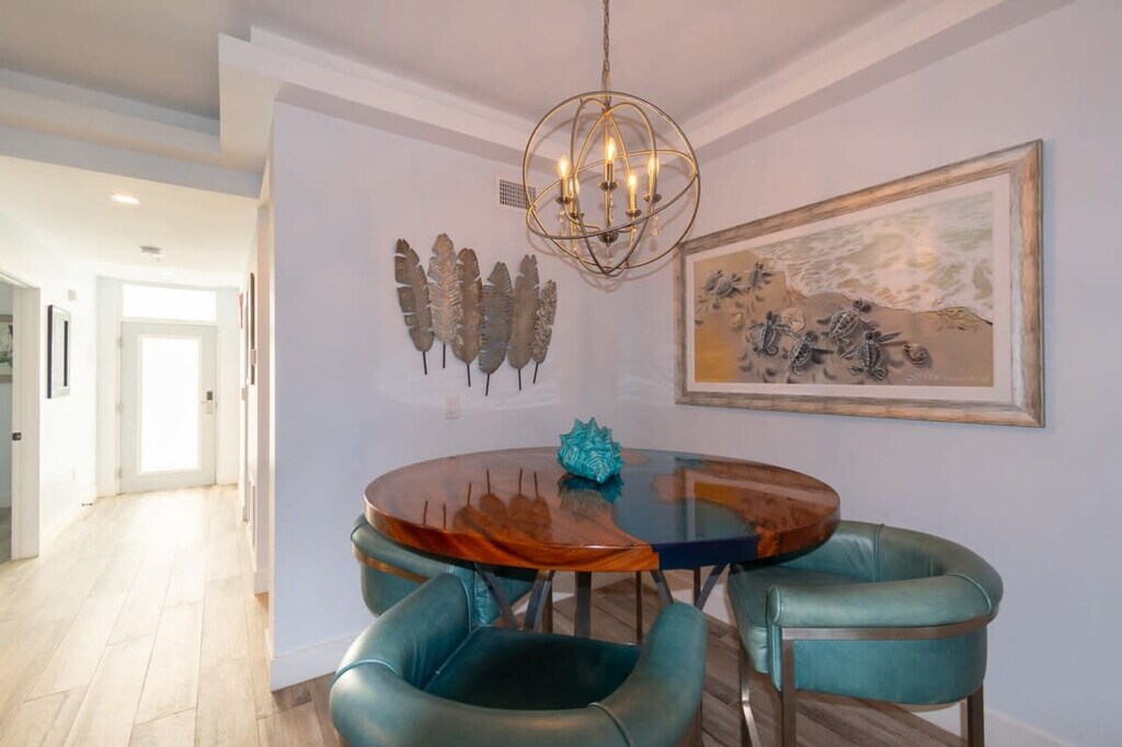 Welcome to Cape Crossing Resort, where you can feel at home in this expansive 6-bedroom, 4-bathroom tropical retreat. This property consists of two spacious townhomes, each offering private dock access to the Indian and Banana Rivers, perfect for boating and fishing enthusiasts. The gourmet kitchens are adorned with granite countertops and stainless steel appliances, ensuring a delightful culinary experience. With 4 king-size beds and 4 twin beds, including 2 master suites with private baths, this home provides ample space for relaxation. Enjoy resort-style amenities such as a pool, tiki bar, and waterfront dining onsite. Conveniently located just 10 minutes from Cocoa Beach, Port Canaveral, and the Kennedy Space Center, and only an hour from Disney World and Universal Studios Orlando, this property is your gateway to Florida's top attractions. Step into your tropical waterfront getaway, where comfort meets adventure. This beautifully appointed home offers open floor plans and spacious interiors, fully furnished for your convenience. The kitchens are fully stocked with custom granite countertops and premium stainless steel appliances, perfect for preparing meals. Relax in plush living areas with Smart TVs and comfortable seating. With luxurious king-size beds and cozy twin beds, plus private master suites featuring walk-in showers, everyone will find their private oasis to recharge after a day of fun. Onsite parking is available, including a one-car garage in each townhome. While only dogs are allowed at this property, a fee of $100 per pet, per stay applies. Enjoy the resort-style pool, gym, and clubhouse, open from 8am to 9pm, for a complete vacation experience. Situated in the heart of Merritt Island, this property serves as the perfect launchpad for your Florida adventure. Whether you're beachcombing at Cocoa Beach, fishing off the Indian River, or exploring NASA history at the Kennedy Space Center, you'll appreciate the easy access. The vibrant dining scene of Cocoa Beach and Port Canaveral is just a short drive away, offering a variety of restaurants and dining experiences. Theme parks, shopping, and endless dining options are within reach, making this location ideal for exploring all that Florida has to offer. Quiet hours are observed from 9:00 PM to 7:00 AM to ensure a peaceful environment for all guests. Check-in is facilitated through digital locks, allowing for a seamless arrival experience. While mailbox access is not available for guests, the property offers an initial stock of essentials such as paper towels, toilet paper, tissues, coffee pods, creamer, sugar, light cleaning supplies, garbage bags, sponges, dish soap, and dishwasher tabs. Please plan to replenish these supplies as needed during your stay. A remote work-friendly environment is provided with Wi-Fi access, ensuring you can stay connected during your stay. However, a laptop computer is not included, so please bring your own device for any work-related needs. [SI]