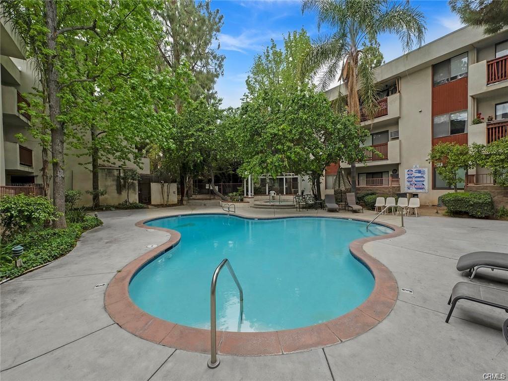 Beautiful upgraded condo, located on the 2nd floor, with balcony overlooking swimming pool and Jacuzzi, centrally located in the complex and convenient to community laundry facility! This beautiful condo is enhanced with new laminate and carpets, enriched with custom baseboards, upgraded dining room lighting, bright kitchen, modern track lighting, stainless kitchen sink and designer cabinet handles. Large master has a walk-in closet. The home is freshly painted and ready for move-in. Controlled access building and parking lot with security camera, elevator and community laundry on each floor. Quick 101 and 118 freeway access, close to shopping and dining and entertainment.