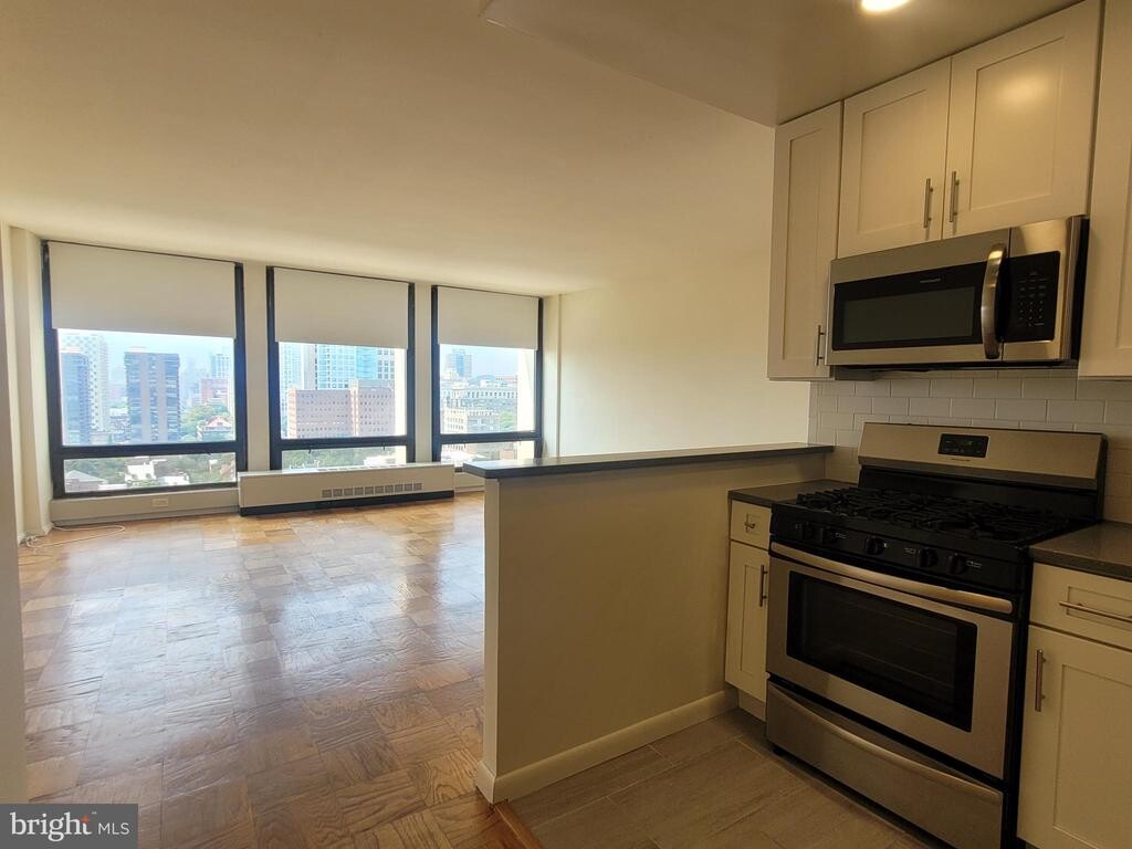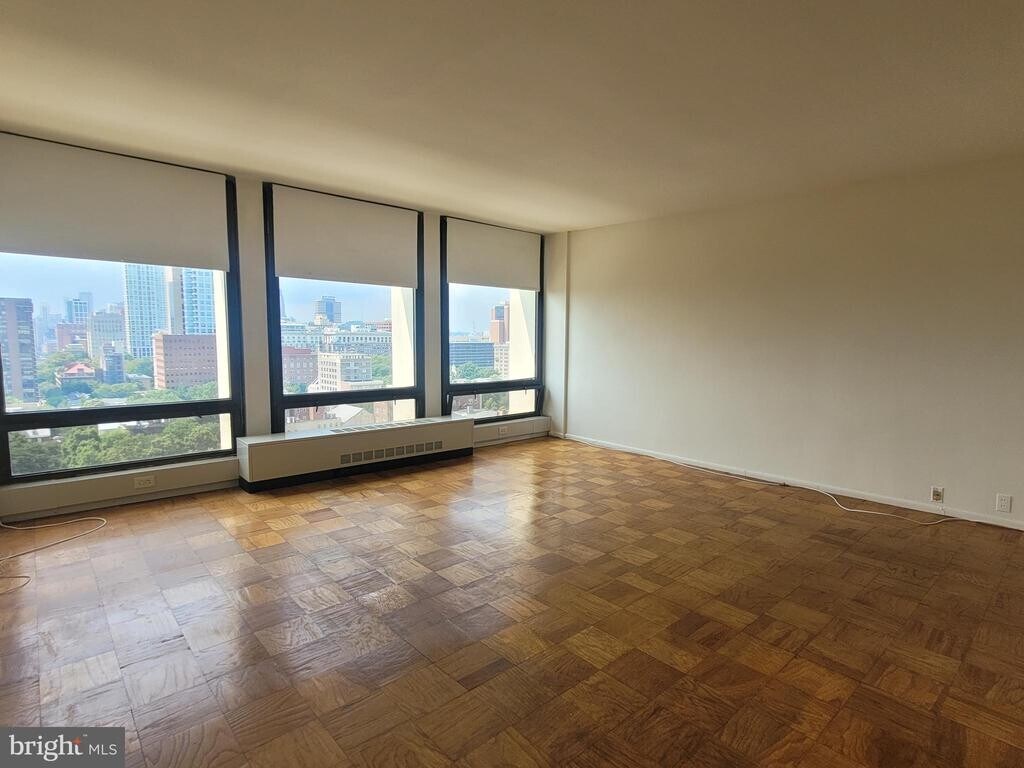 Spacious one bedroom, one bathroom on a high floor of Society Hill Towers. This sunny home boasts large floor-to-ceiling windows with views to the west; parquet hardwood flooring throughout; a spacious living/dining room perfect for entertaining; an open galley kitchen with white shaker cabinetry, granite countertops, subway tile backsplash, and stainless steel appliances; a large bedroom with plenty of natural light and ample closet space; and a hall bathroom with tub shower. Residents of Society Hill Towers enjoy a 24 hour doorman, underground parking, access to the fitness room and outdoor pool for a fee, available hospitality suite for a fee, on-site Philly Car Share, coin operated laundry room in basement, and shopping plaza on site with market, dry cleaner, and beauty salon.