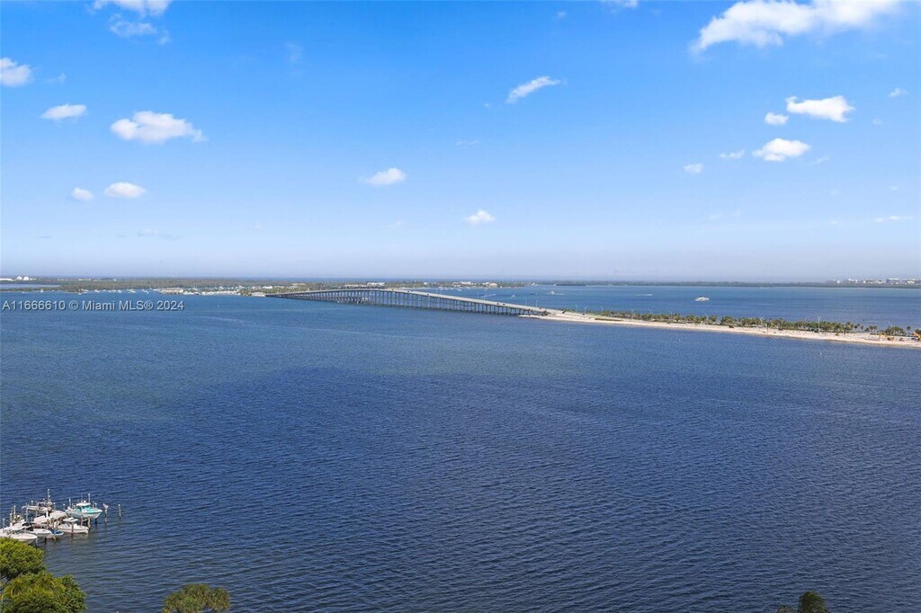 The interior living area is 791 sq. feet plus a 250 sq. ft. balcony with breathtaking views of Biscayne Bay, the Rickenbacker bridge, and the famous hole in the Atlantic building next door. The apartment has northern exposure, giving you gorgeous sunrises in the morning, but never direct sun. Just happy light with no baking heat. The floors are cream-colored marble, with the lightest of blue-grey walls.