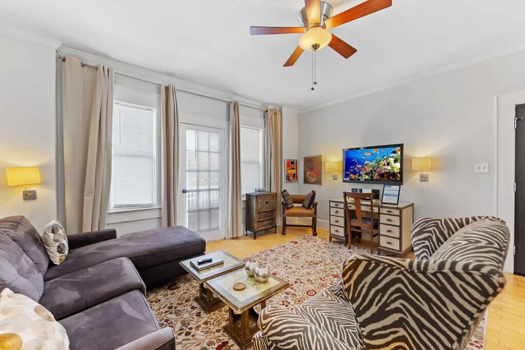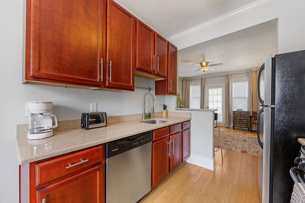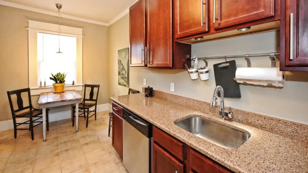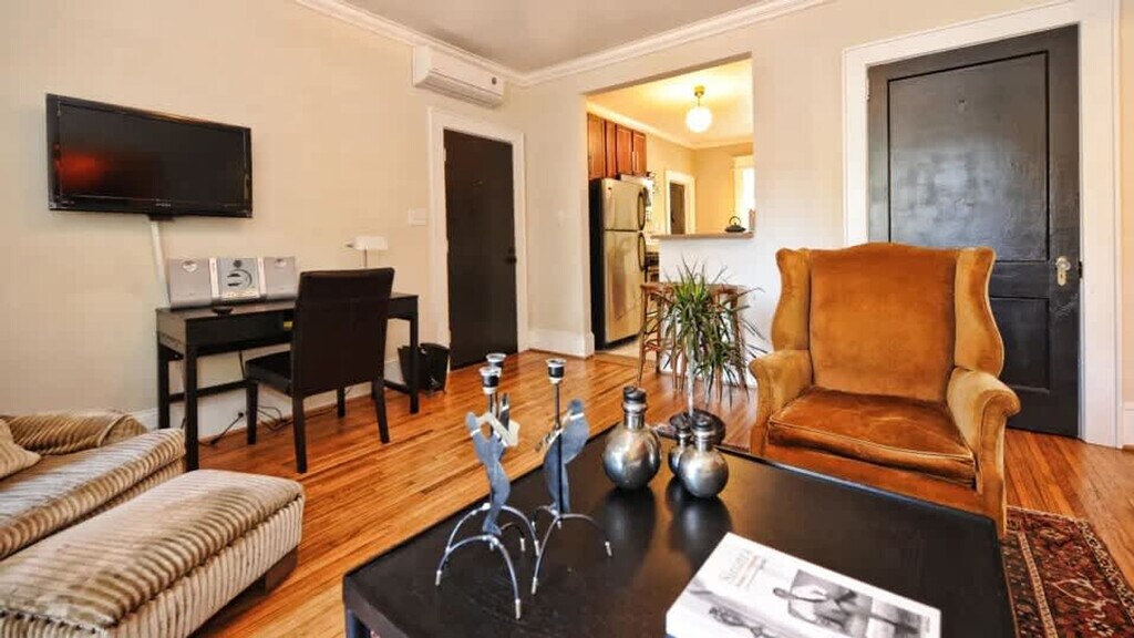 Feel at home in this 1-bedroom condo located in the heart of Charlotte's most walkable and desirable historic Dilworth neighborhood. This unit is fully furnished with an en-suite washer and dryer, a fully equipped kitchen with brand-new cabinets, quartz countertops, and stainless steel appliances including a gas range and refrigerator with an ice maker, ultra-fast Wi-Fi, Hulu Live TV, and a private porch. Complimentary snacks and beverages are provided. There is also a desk, Wi-Fi, and a small stereo CD player with a place for your iPod or MP3 player. A large flat-screen television in the living room is Wi-Fi enabled and streams Netflix and Hulu. The bedroom also has a flat-screen TV. There is also a common area with a gas grill and outdoor dining available. Onsite parking is available. Charlotte’s biggest and best fitness center, the Dowd Y, is only five minutes away. Amenities include cardio equipment, weights, group classes, and swimming. A 7-day pass is $50. If you are traveling with a dog, it must be registered at a cost of $59 per dog (two maximum). If you do not register your dog, you will be charged $120 per dog. Located on a quiet residential street in Historic Dilworth, this condo is 1.5 miles from Uptown. The neighborhood has a mix of stately homes and craftsman bungalows, many built in the early 1900s, along with several vibrant commercial areas that provide an abundance of local restaurants and shops, making Dilworth the most pedestrian-friendly, walkable neighborhood in the city. You'll be able to walk to 3 parks, two full-service grocery stores, 40+ restaurants, massage studios, coffee shops, art galleries, consignment stores, neighborhood pubs, and other amenities, along wide sidewalks under huge willow oak trees. A transit stop 1/2 block away provides bus service directly to Uptown, the Convention Center/Time Warner Arena/Panthers Stadium, and in the other direction to SouthPark every 15-20 minutes. The Lynx Blue Line light rail is only a 15-minute walk away, with trains going directly to Uptown in 10 minutes. Carolinas Medical Center (Levine Children's Hospital) is 4 minutes away by car or an easy 15-20 minute walk. Quiet hours are between 10 pm and 7 am. Dogs are never allowed on the furniture or bed. If there is hair on the furniture, excess hair in the home, stains, damage, or waste found in the yard or home, you will be charged an additional fee. No parties, additional guests, events, or large gatherings are permitted in the property. Smoking and vaping are not allowed inside/outside the home or building. Guests must be at least 21 years old to make a reservation, and this rule is strictly enforced. [SI]