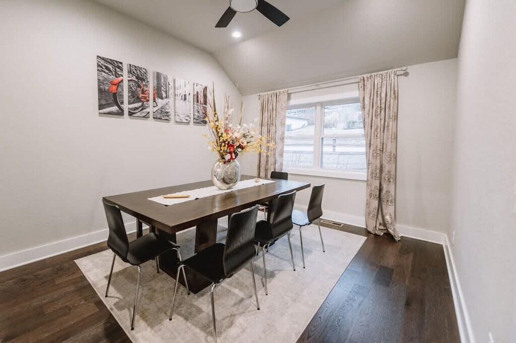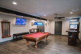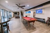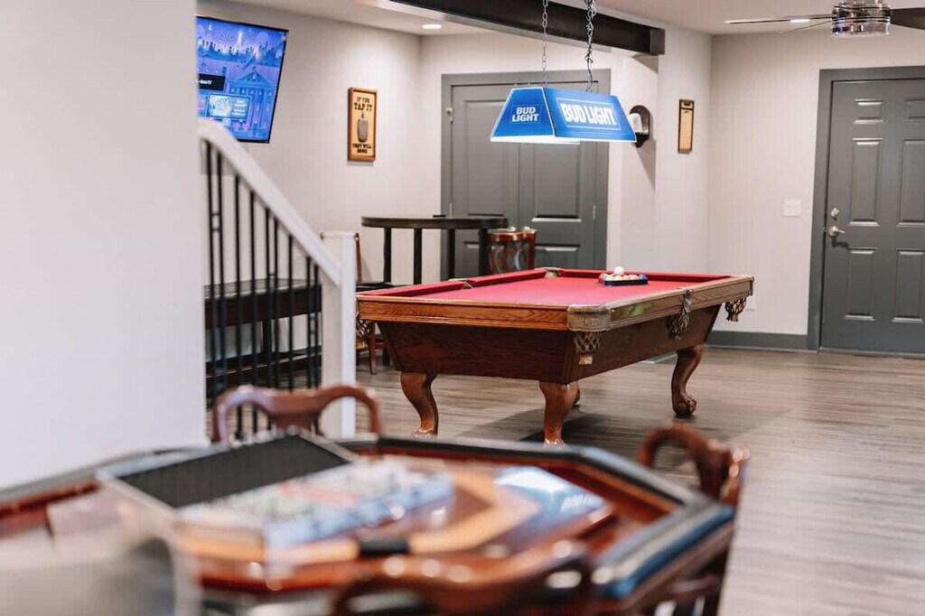 Welcome to The Almand House, a huge home in the center of Bentonville where you can feel at home! Located along the Tristan and Action Alley MTB trail, this home is stocked with amenities bikers will love. This home features a decked-out patio with a dining table, grill, Smart TV, fireplace and cozy seating, an epic game room with a poker table, pool table, board games, and a Hunter Arcade Game, a large, open concept living room with a Smart TV, seating, and a fireplace, two dining spaces, and a modern, fully stocked kitchen with the essentials you'll need to create your favorite meals. There is also a washer and dryer for guest use. This is a pet-friendly home with a fee of $90 per dog, with a maximum of 3 dogs allowed. Two Pack 'n Plays and two highchairs are available. Secure bike storage is available in the garage. Ride or drive just 3 miles to Downtown Bentonville for Northwest Arkansas favorites. This home is 0.7 miles to Bentonville Bike Playground, 3 miles to Downtown Bentonville & Crystal Bridges, 4 miles to The Momentary & 8th Street Market, and a 2-mile ride via Tristan MTB trail to the Slaughter Pen Hollow trailhead. Bentonville is home to Northwest Arkansas' premier mountain bike trails, restaurants, and museums. Walk, drive, or easily ride your bike to access all the amenities downtown Bentonville has to offer! Parties or guest actions that result in disturbances, property damage, extensive extra cleaning, or smoking indoors will incur a fine of $1,000. Dogs discovered at the property without prior notice or cats discovered at the property will incur a fine of $400. Unauthorized checkout delays will incur a fine of $100 per hour. If you smoke in the home, you will be fined $1,000 plus the cost of any smoke remediation necessary. Quiet hours are between 10:00 PM and 10:00 AM. [SI]