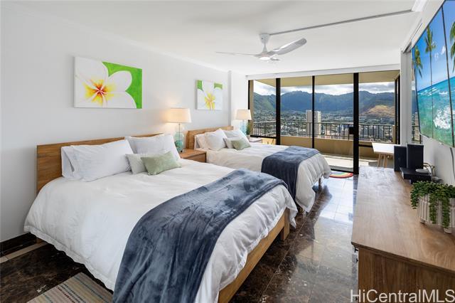Available: April 1st, 2026. Situated in Waikiki, this exceptional 2-story apartment exudes style and modernity, offering breathtaking views and refreshing trade winds. Fully renovated and furnished to perfection, this unit on the 41st floor features stainless steel appliances, elegant Herman Miller furniture, a luxurious TOTO bidet, deep soaking tub, sumptuous Natuzzi leather sofa, and more.With two balconies providing expansive views and 316 square feet of living space, both floors are easily accessible. The top floor hosts the living and dining areas, while the lower level accommodates 2 bedrooms and 2 bathrooms accessible via an internal staircase.Included are two covered parking spaces, along with all utilities, electricity, water, internet included in the rent, and cable.Residents can enjoy community amenities like a pool,sauna,and clubhouse, overseen by an on-site resident manager. With Waikiki Beach nearby and convenient freeway access, this location is ideal. No pets or smoking/vaping permitted.