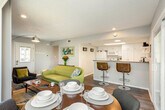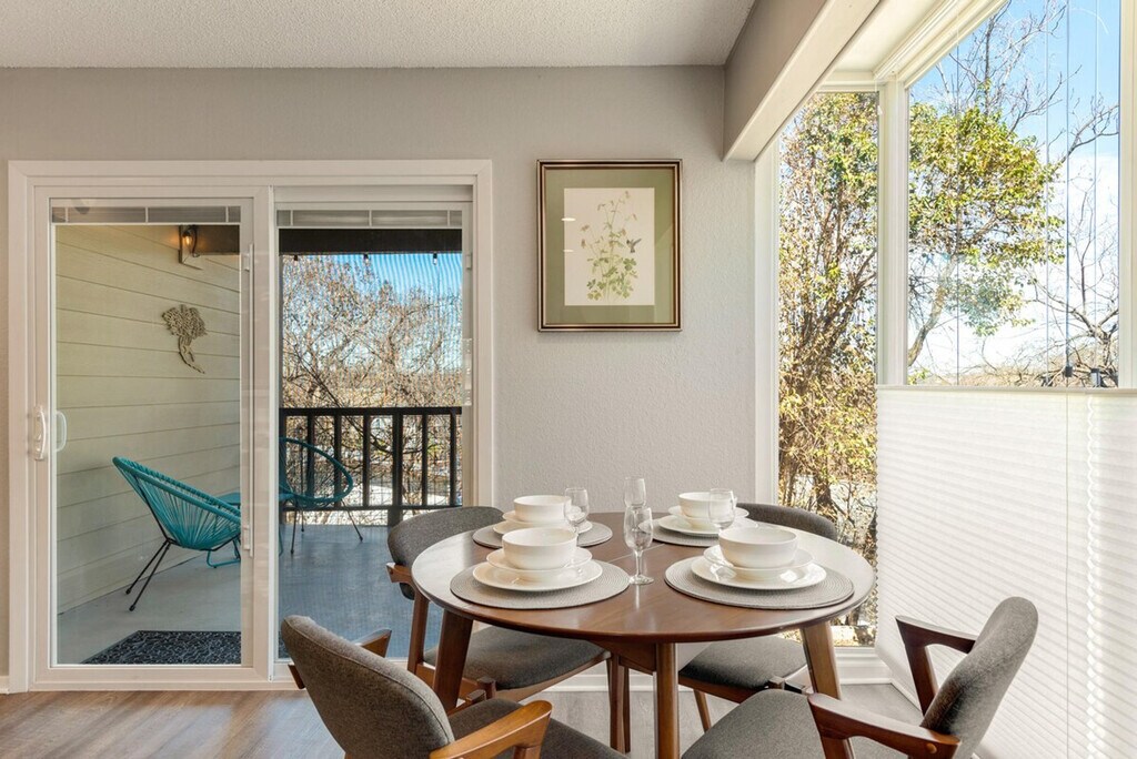 Feel at home in this charming two-bedroom apartment located just 0.33 miles from Zilker Park and Barton Springs Pool. This unit features a "Hollywood" bathroom with a second sink/vanity in the master bedroom, which can be closed off from the main bathroom. Enjoy the sun shining through the floor-to-ceiling windows in the dining area or relax on the covered patio with comfy furniture. The kitchen is fully equipped with essentials such as a coffee maker, coffee grinder, electric water boiler, toaster, blender, cookware, silverware, ceramic and plastic dishes, a four-burner stove, oven, and microwave. Additional amenities include bed linens, four sets of towels, four beach towels for Barton Springs, an iron and ironing board, a hair dryer, and free laundry in the laundry room on the first level. Pets are welcome with a fee ranging from $50 to $100, depending on the length of stay. For monthly stays, an additional $50 will be added after booking. Cleaning fees are $115 for short stays and $200 for monthly stays. Mid-stay cleanings are available for $25 per hour. Guests receive a 10% discount on bike rentals or tours with Barton Springs Bike Rental and Tours. There is one reserved off-street parking space right in front of the door and additional free parking on the street. Nestled in the beloved Zilker/Barton Hills neighborhood, this apartment offers access to huge trees, quiet streets, and proximity to Barton Springs, Zilker Park, and the hike and bike trail. Just 2 miles from downtown, you're also close to restaurants and shopping on S. Lamar, S. Congress, and S. 1st streets. Public transport is accessible with a bus stop about 2/3 mile away on Barton Springs Rd, and bike and scooter rentals are plentiful. Contactless check-in is available with a keyless deadbolt. Additional linens, floor sleeping mat, bed rails, baby equipment, pet furniture covers, dog crate, or baby gate are available upon request. Important house rules are posted in the property. The apartment includes a desk in the smaller second bedroom, making it suitable for remote work. High-speed Wi-Fi is available, ensuring a seamless work-from-home experience. A laptop computer is not included. [SI]