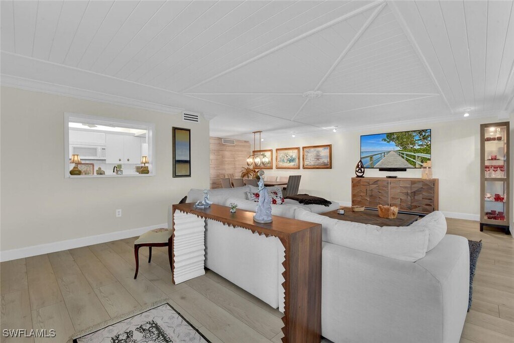 BOOKED FOR 2025!! 90-day min. This one-of-a-kind,professionally designed residence with spectacular Moorings Bay views,is just a short walk over to a sandy,white pristine beach and Gulf of Mexico! A wonderful location to walk or bike to the Venetian shops,galleries and restaurants,and a short drive to the Olde Naples epicenter. Residents of The Moorings find themselves only moments from the very best attractions Naples has to offer. The expansive floor plan affords plentiful areas to entertain while still offering a large,private master suite,as well as an additional guest bedroom and full bathroom. As soon as you walk through the front door,you will find an inspiring main living area with abundant natural light,white quartz countertops,solid wood cabinetry,stainless steel appliances,5-inch custom architectural shutters,raised ceilings,and custom mill-work throughout. The living area offers a large comfortable couch,2 comfortable leather swivel chairs,flat-screen TV. and whimsical art. The Kitchen is well stocked,has a large island,kitchen table/seating and opens out to the living area for easy entertaining. The dining table seats six. The Master Suite offers a king-size bed,walk-in closet,large flat-screen TV and private bath with a spacious walk-in shower. The Guest Bedroom has a queen-size bed,flat-screen TV,spacious closet and bath with a shower. The sugar sand Gulf beaches are only a short five-minute walk away,and the pool with a renovated indoor/outdoor kitchen is just steps from your front door. Located near Old Naples cultural epicenter,as well as upscale dining and world-class shopping at Venetian Village,residents of The Moorings find themselves only moments from the very best attractions Naples has to offer. Several generous direct Gulf-access boat slips are available for lease. A short walk to the beach and minutes away from the Venetian Village for dining,shopping and galleries.