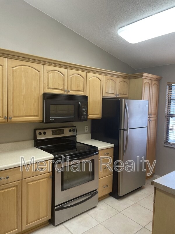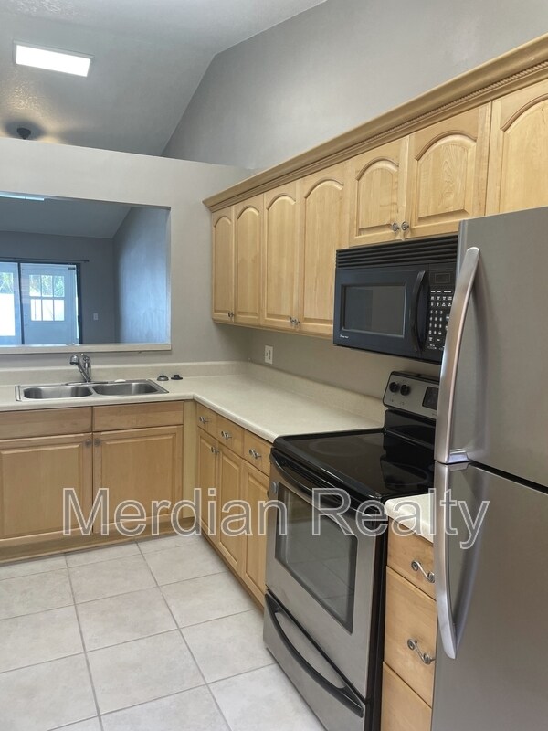 Entry opens to your Large Vaulted ceiling in the living room, open kitchen plan, new LED lights, tile floors throughout, no carpet to vacuum. Large bedrooms with nice refurbished bathrooms. Unit has a washer dryer located inside. Both bedrooms and the living room have ceiling fans and light kits. Property has an outdoor storage unit as well as a dedicated parking space. Enjoy your large community pool! Crown molding in kitchen, stainless refrigerator and stove, clean!