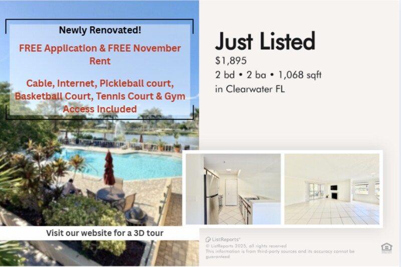 *** FREE APPLICATION & FREE NOVEMBER RENT *** ** New listing with 10 Stars Property Management ** For any questions regarding the property or the rental process please call or text Beautiful 2 beds 2 bath is available for rent in Clearwater, FL. Welcome to 2400 Feather Sound Drive – where lifestyle and convenience meet in one of Clearwater's most desirable neighborhoods! Just minutes away, you'll find yourself on the scenic Courtney Campbell Causeway Trail, perfect for biking, jogging, and watching sunsets over the Bay. Nature lovers will appreciate being close to Moccasin Lake Nature Park, a 51 acre preserve featuring boardwalk trails, a butterfly garden, and a bird of prey sanctuary. For days when you crave sunshine and sand, Clearwater Beach is nearby renowned for its sugar white sands, sparkling waters, and vibrant pier side activities. Shopping, dining, and entertainment are also at your fingertips within the Feather Sound region, with plenty of local gems and premium amenities to explore. Whether you're enjoying a peaceful nature walk, an active afternoon on a trail, or an evening out with friends and family, this home places you in the heart of it all. 3D Tour Available: Features: - Application fee will be credited back on the 1st month of rent if approved - Stylish combination of luxury vinyl plank and tile flooring for a modern, seamless look - Spacious dining/living area perfect for gatherings and entertaining - Sleek stainless steel kitchen appliances for everyday convenience - Convenient dishwasher makes cleanup after meals effortless - Cozy fireplace for added warmth and charm - Ceiling fan in bedroom for added comfort and airflow - Window coverings offer privacy and light control - Screened-in patio for year-round enjoyment without pests - Beautifully remodeled bathrooms designed with modern fixtures, and a sleek, contemporary feel - Bathtub and standup shower for versatile bathing options - Walk in closet for ample storage and organization - Laundry room equipped with washer and dryer for convenience - Pickleball court, Indoor basketball Court, Tennis Court & Gym access for leisure - Cable and Internet Included - Tenant is responsible for power, sewer, trash, water & lawn care No pets allowed. Does not apply to medically/emotional support prescribed and/or service animals. Details on our website: At 10 Stars, we offer multiple services to make your stay with us easy and comfortable. We have a same-day application approval and a quick move-in for no additional cost. Our team is professionally trained and will be able to assist with any leasing, billing, or maintenance issues our tenants have. We also offer an emergency line available 24/7 for any urgent cases. Tenants have access to an online portal where they can make rent payments, communicate with our team and get updates on their payments and maintenance requests at all times. THE FIRST MONTH AND SECURITY DEPOSIT ARE REQUIRED All residents are automatically enrolled in the 10 Stars Resident Benefits Package at a cost of $7.99 per month. This program was developed to enhance the overall rental experience by providing added convenience, protection, and value throughout the lease term. Enrollment is required and cannot be waived. The package may only be initiated at the time of lease signing or renewal and includes a range of benefits designed to promote a more efficient, flexible, and secure tenancy. Please see the link below for more details. Renter's insurance is required prior to moving in. Rules and Regulations are on our website! Only $65 non-refundable application fee per adult with 10 stars property management