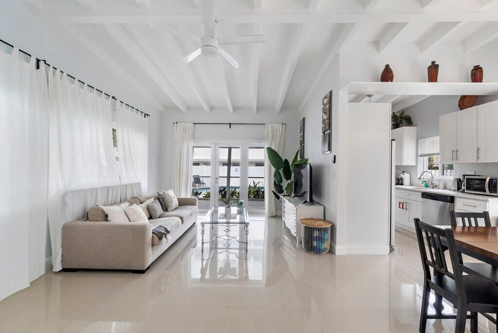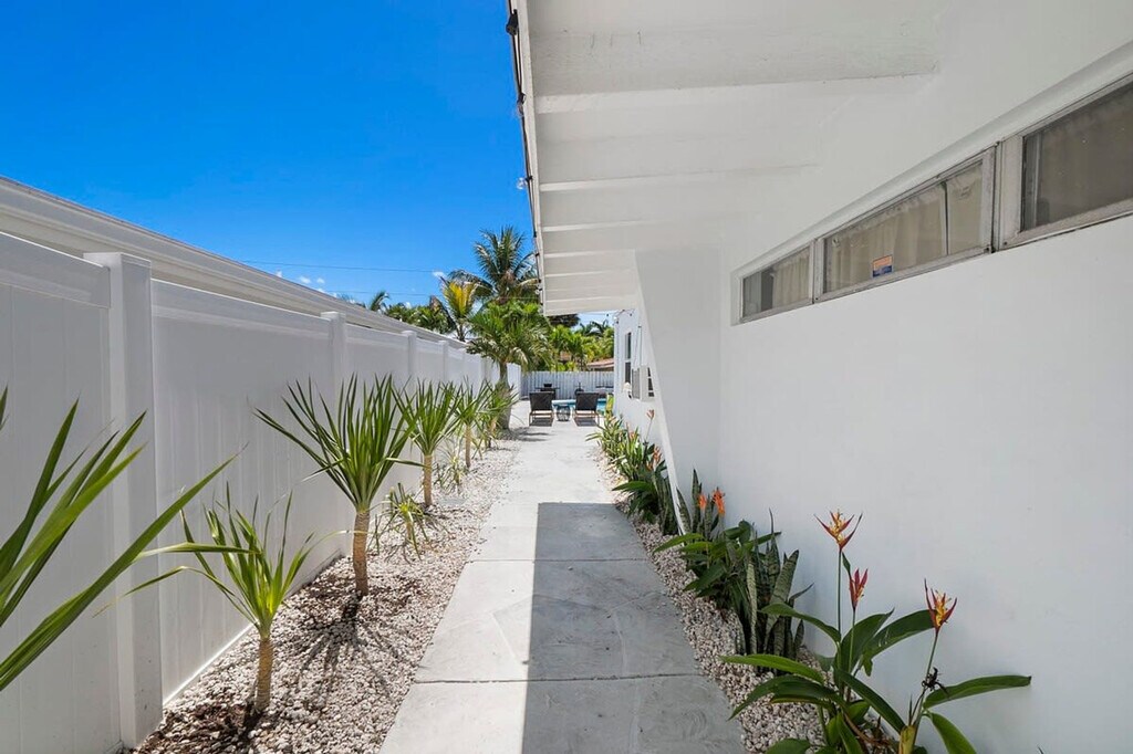 Welcome to the Sandbar, your dream vacation destination in sunny South Florida! This 3-bedroom, 2-bathroom unit offers everything you need for a memorable stay. Feel at home as you enjoy the shared pool or take a short two-block walk to the stunning Fort Lauderdale Beach. With high-end appliances and a fully equipped kitchen, this apartment comfortably sleeps your entire family. The Sandbar unit is part of "Palm Paradise Inn- the Beach," which consists of three units sharing a pool and a spacious backyard. Enjoy the privacy of your unit or mingle with new friends in the common areas. The apartment features an in-unit washer and dryer, making it convenient for longer stays. The fully equipped kitchen is perfect for preparing home-cooked meals or big family breakfasts. Pets are welcome with a fee of $125 per stay. We kindly ask that pets are kept off the furniture, and crate-trained pets are preferred. Free parking is available for your convenience. Nestled in the vibrant North Fort Lauderdale Beach area, this apartment is just a 5-minute drive from the famous Fort Lauderdale Beach and 10 minutes from Lauderdale by the Sea. The neighborhood is walkable and bike-friendly, with nearby attractions like Cafe Martorano and Coral Ridge Mall, which is a 7-minute drive away. While a car is recommended for exploring South Florida, many local spots are easily accessible on foot or by bike. This property consists of three units, with the backyard, grill, and pool being shared spaces. The apartment is private and exclusive to you. There are no parties, no unregistered guests, and no smoking allowed anywhere on the property to maintain a family-friendly environment. Exterior cameras are located at the main entrance, side gate entrance, and pool for safety, but there are no cameras inside or facing into your unit. The pool is heated to about 20 degrees above ambient temperatures, with a maximum of 85 degrees. Please consider this if booking during Florida's colder months. [SI]