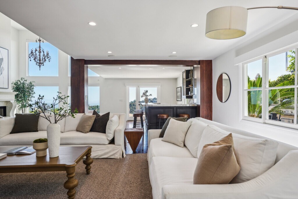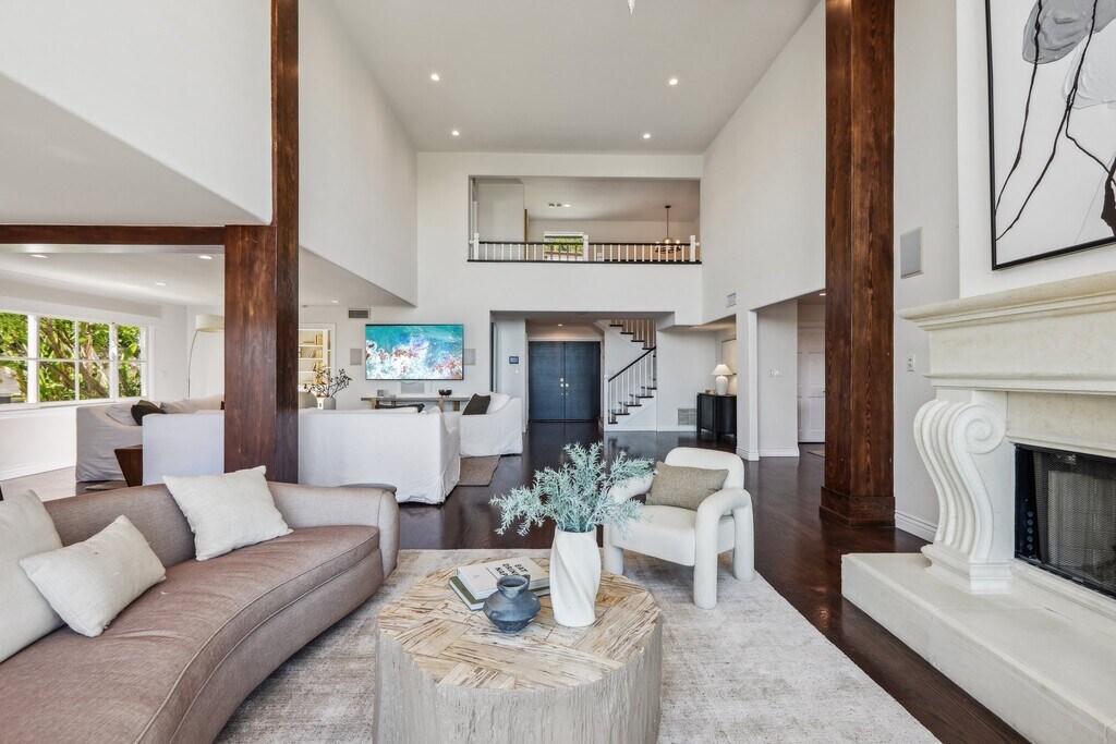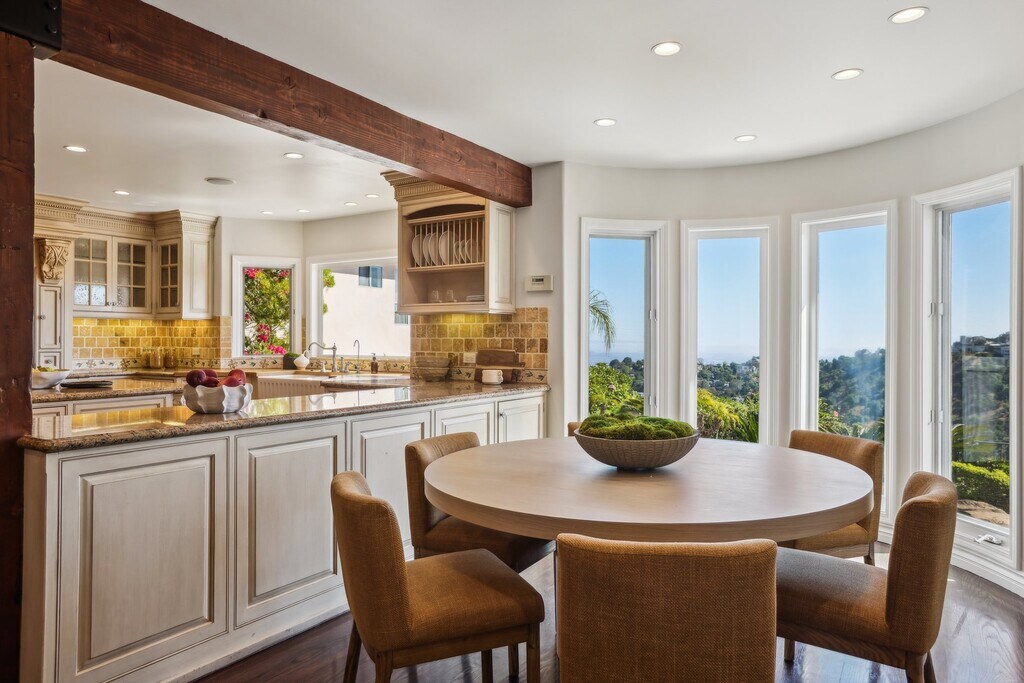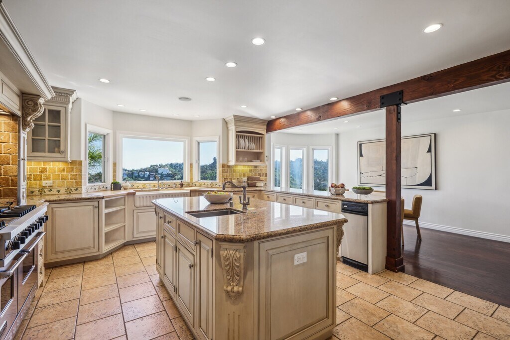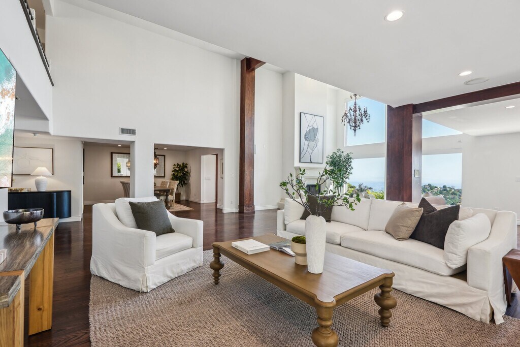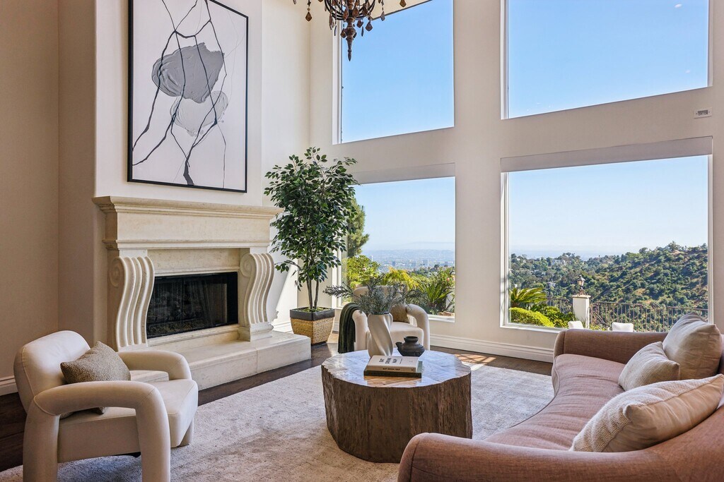 Perched at the Summit of Mount Olympus and tucked away at the end of a peaceful cul-de-sac, this extraordinary 5-bed/5-bath estate, including an office and a detached guesthouse offers an unparalleled blend of luxury, privacy, and breathtaking views. A true entertainer's dream, this Contemporary Mediterranean masterpiece is thoughtfully designed to capture the essence of California living. Step into the expansive Great Room, where 20-foot soaring ceilings, rich hardwood floors, an elegant fireplace, and grand Palladian windows frame sweeping views of the city, canyon, and ocean beyond. Whether hosting formal gatherings or relaxing with loved ones, the space seamlessly combines comfort and sophistication. The Gourmet Chef's Kitchen is equally impressive featuring custom wood cabinetry, granite countertops, a generous center island, and a full suite of top-tier Viking appliances, including a full-height wine refrigerator. A built-in Miele espresso machine ensures your mornings are as refined as your evenings. The formal dining room and adjacent breakfast area offer elegant spaces for every occasion. This home boasts two expansive master suites, each offering a private sitting area, spa-inspired en suite bath, and serene balconies. Outside, a true oasis awaits. The meticulously landscaped backyard is a private retreat, reminiscent of the world's most luxurious resorts. Lush gardens envelop a resort-style pool with spa and cascading waterfalls, creating a serene ambiance perfect for relaxation or entertaining. With its seamless indoor-outdoor flow, smart technology, guest accommodations, and dramatic panoramic vistas, this rare offering defines high-style living. Sophisticated yet welcoming, this home is the ultimate Southern California sanctuary. Offered as the quintessential retreat for those seeking privacy, elegance, and inspiration at every turn.
