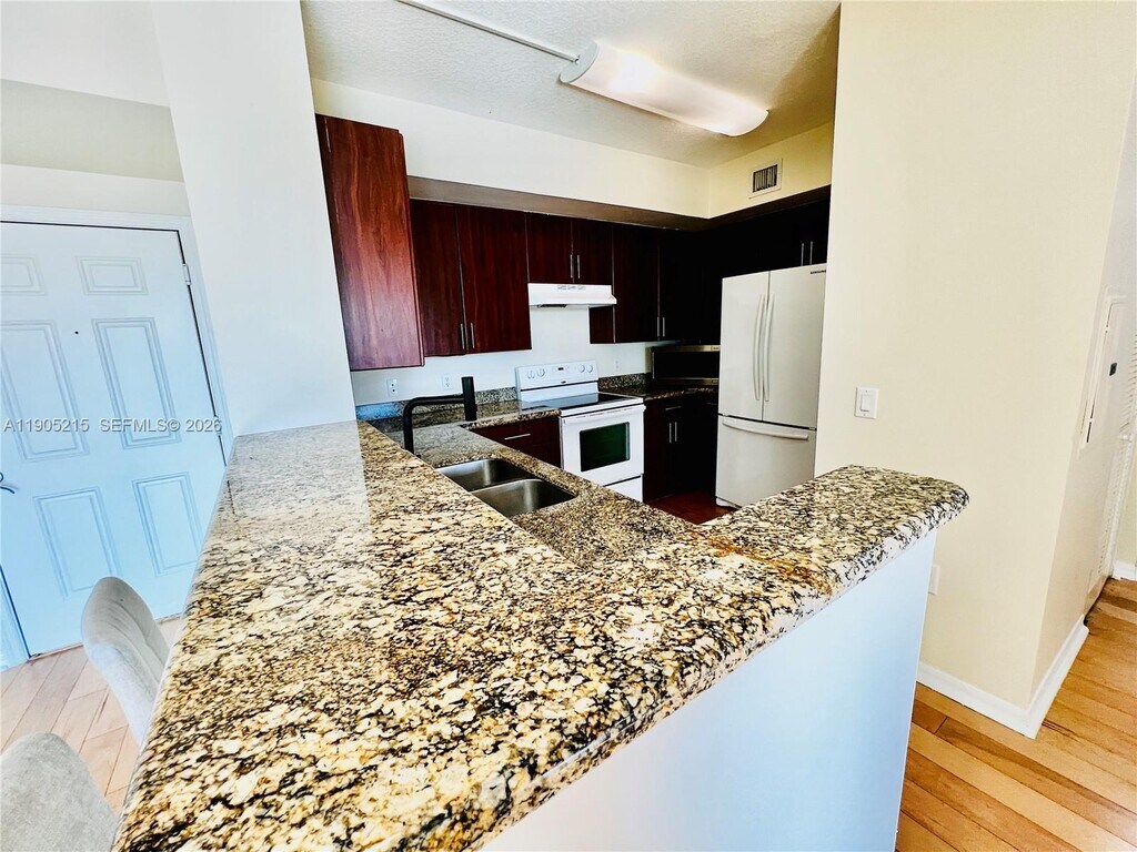 Remarks Remarks: Great Location, just minutes from shopping, dining, beaches and hwys! Elegant & Spacious Penthouse Corner Condo offers 1,506 sqft, in a luxury boutique building with resort-style amenities - heated pool, fitness center, sauna, business center, and EV charging station. The modern kitchen has granite countertops, ss appliances, and lots of cabinet space. The primary suite includes an oversized walk-in closet. The bright living and dining areas flow to a private balcony with beautiful views—ideal for relaxation or entertaining. Additional highlights include impact windows, laminate wood flooring, in unit w/d, and high-speed Wi-Fi included. 2 garage spaces and guest parking. Association required $1200 moving deposit refundable.