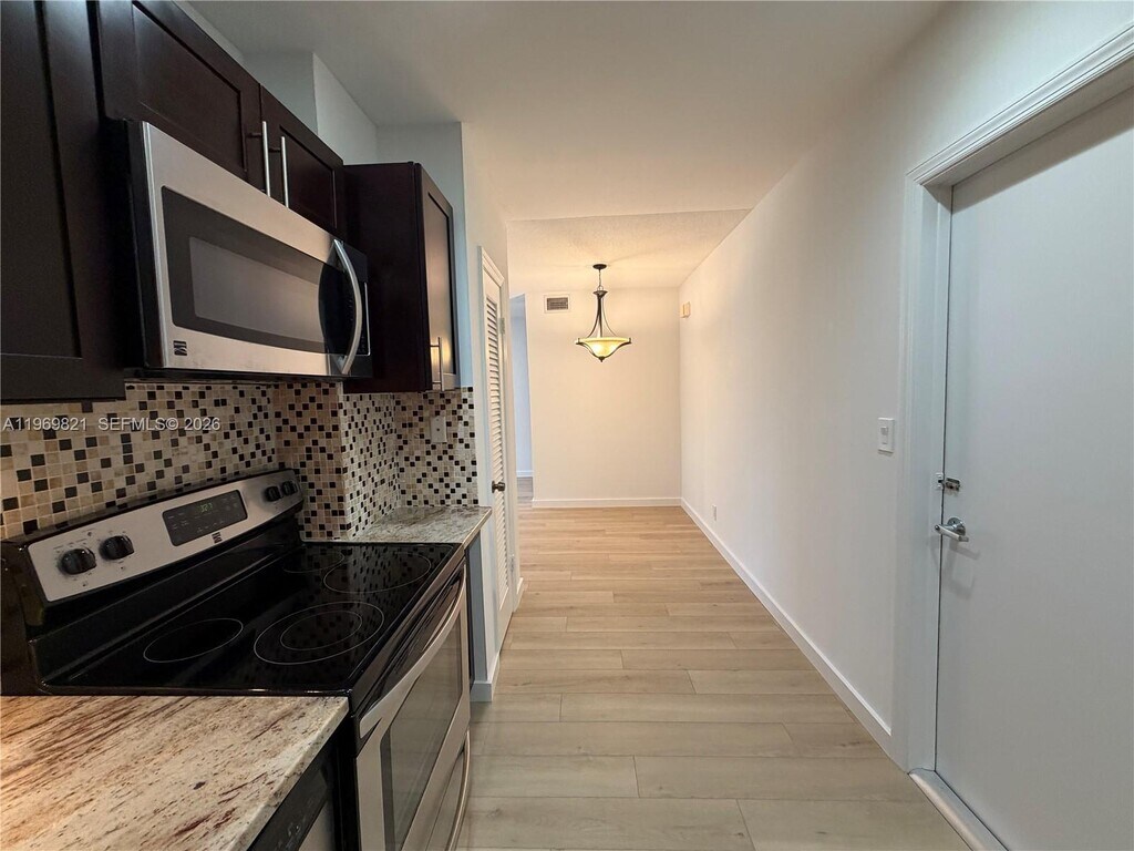 Beach condo newly remodeled and ready for move-in. Designer finishes include stainless steel refrigerator, oven, microwave and dishwasher, gorgeous quartzite countertops, tiled backsplash, built in pantry space. The main living area offers plenty of natural light and space with an adjacent dining room/office space. Spacious primary bedroom with walk-in closet. New flooring throughout with light gray plank wood that matches every style. Excellent beach location, close to all and convenient assigned parking just steps from your front door. Community offers pool and fitness. See it today before it's gone! MLS # A11940055