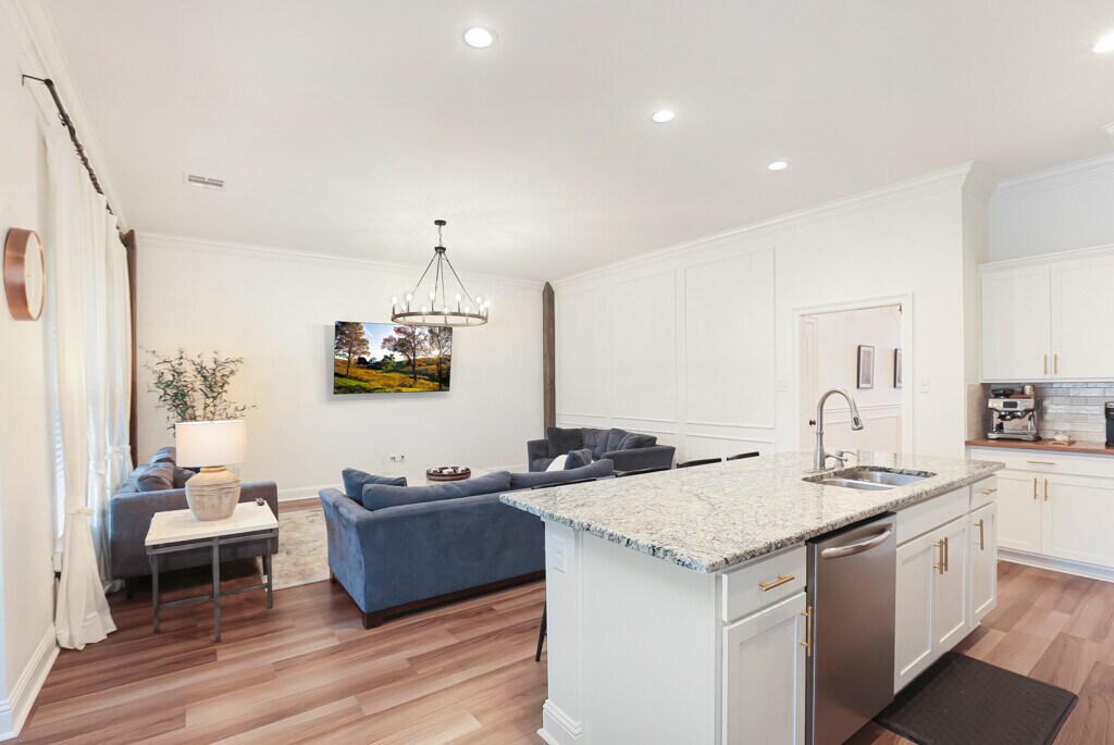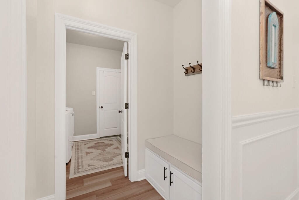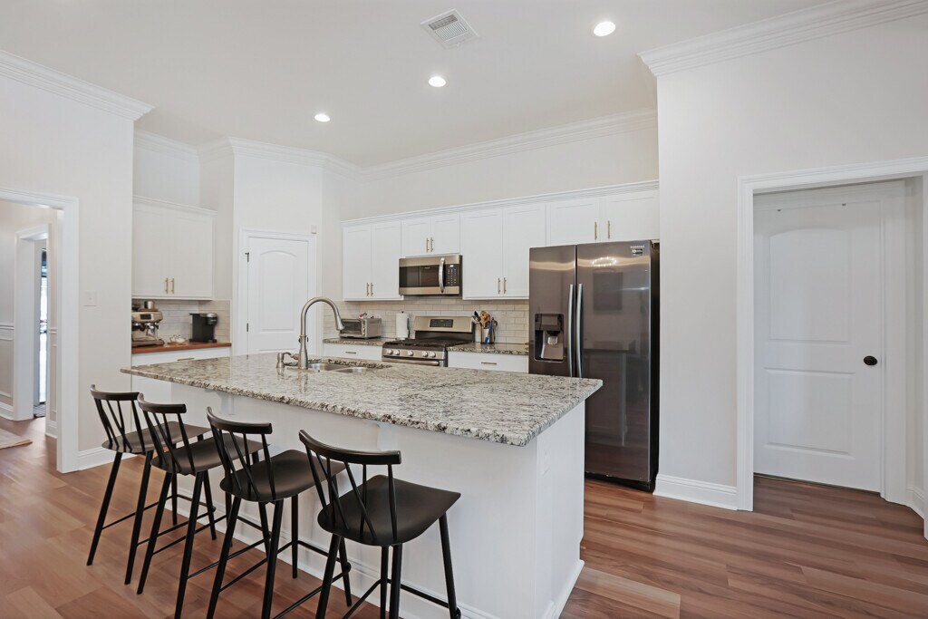 Stunning three-bedroom, two full bathroom home featuring an open, split floor plan. The kitchen offers granite countertops, a gas stove, stainless steel appliances, tile backsplash, kitchen island, walk-in pantry, and an eat-at bar that opens to the main living areas. The primary suite includes a private water closet, double vanity, garden tub, separate shower, and a walk-in closet with direct access to the laundry room. Additional features include a mudroom with boot bench, recessed can lighting in the kitchen, crown molding, a beautiful wood-accent ceiling in the dining area, and luxury vinyl plank flooring throughout the living room, hallways, and all wet areas. Enjoy the covered rear patio and fully fenced backyard. The home also includes a WiFi-enabled thermostat. No pets allowed. Twelve-month lease required.