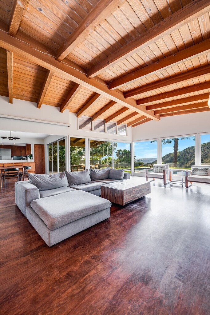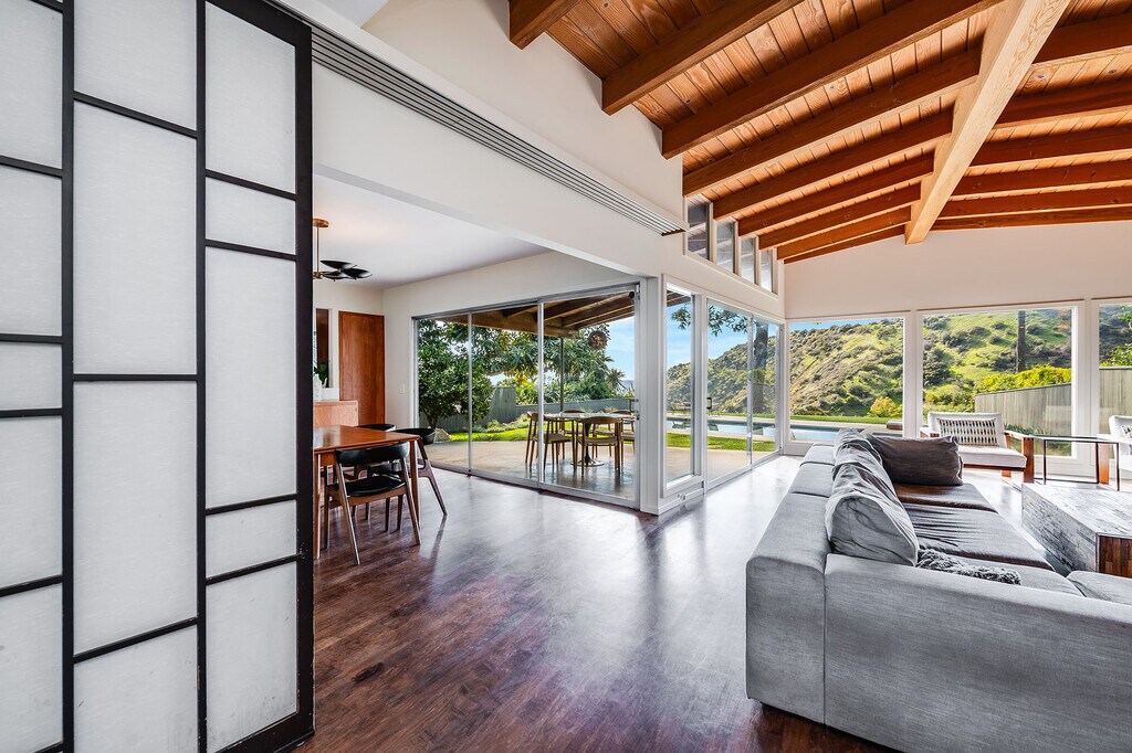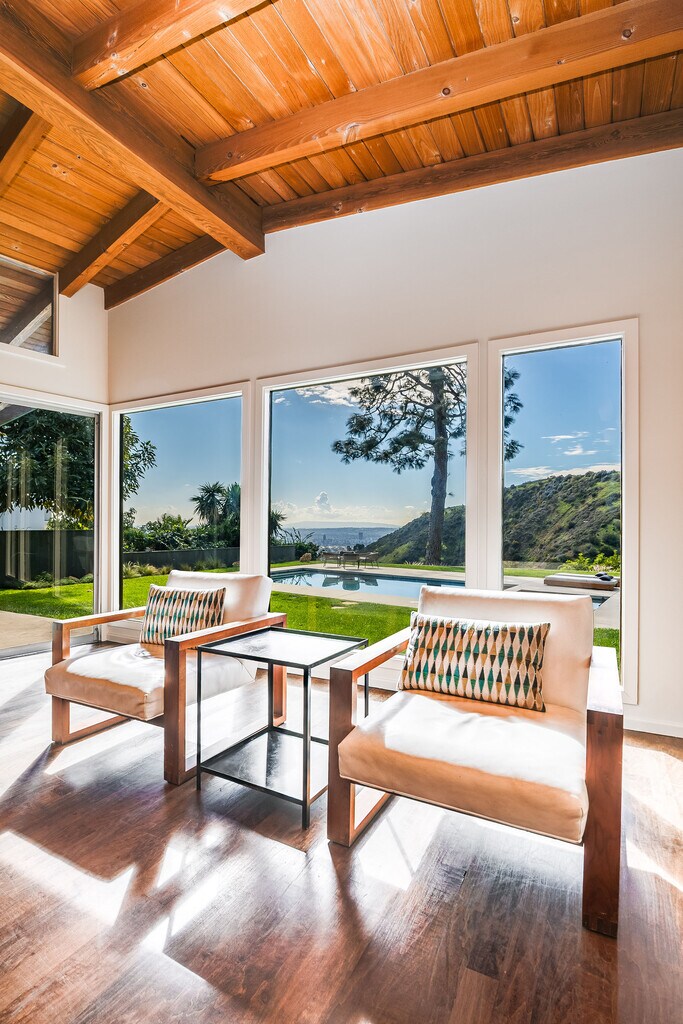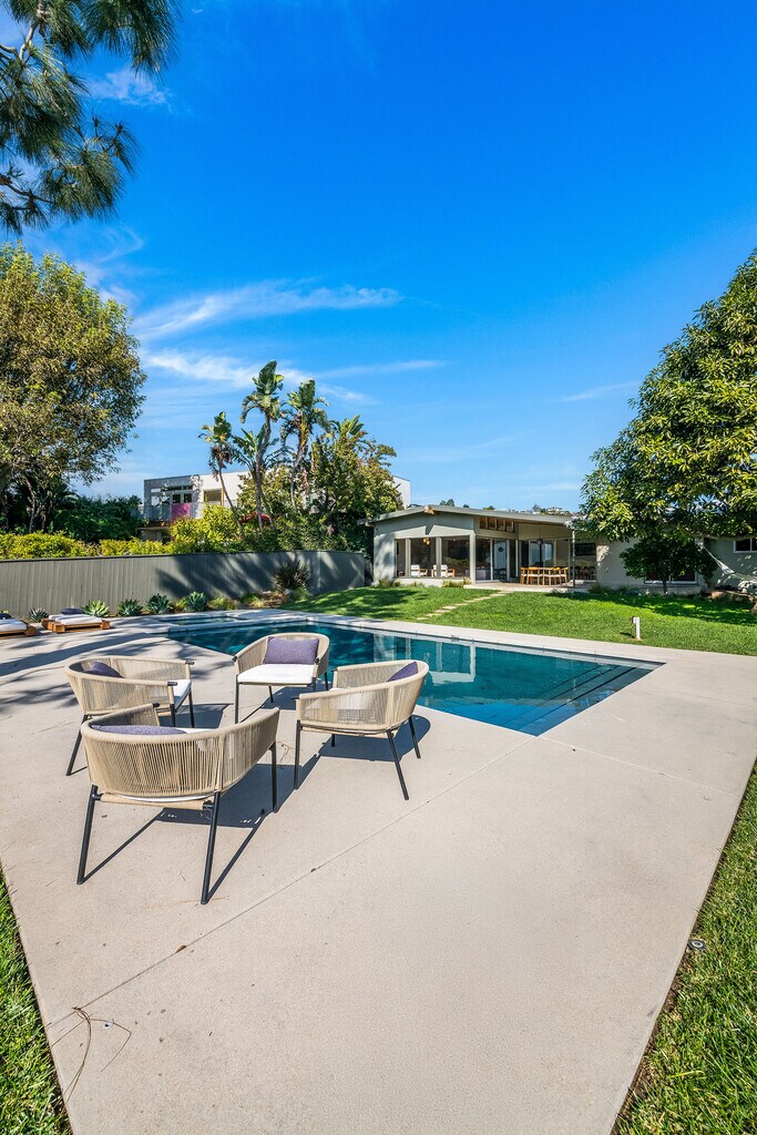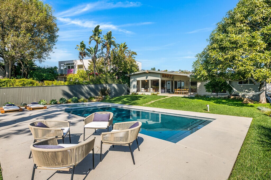 Stunning Mid-Century retreat in prime Outpost Estates, set on a quiet cul-de-sac moments from Runyon Canyon. This private Hollywood Hills escape offers sweeping city views, a beautiful pool with spa, and an expansive flat yard, an ideal indoor/outdoor setting for relaxing or entertaining. A spacious living and dining area showcases an open floor plan with classic 1950s architectural details and walls of glass that frame the views. The remodeled chef's kitchen features all-Miele appliances, Ann Sacks tile, and sleek electronic touch-open cabinetry. The home offers 3 bedrooms and 3 bathrooms, including two generous primary suites, each designed for comfort and privacy, perfect for guests, work-from-home living, or flexible household needs. A 2-car attached garage provides excellent convenience and storage. Located just minutes from the Studios, the Sunset Strip, and the best of Hollywood, this exceptional Mid-Century residence can be delivered furnished or unfurnished to suit your lifestyle. A must-see lease opportunity in one of the Hills' most coveted neighborhoods. MLS# 25621919