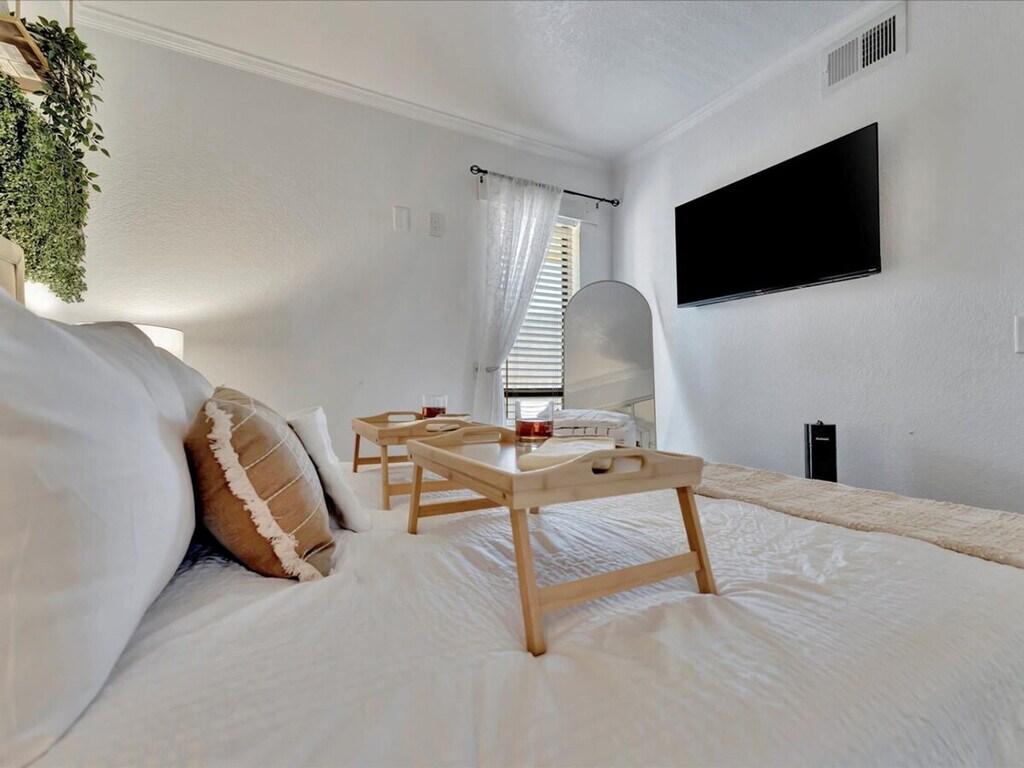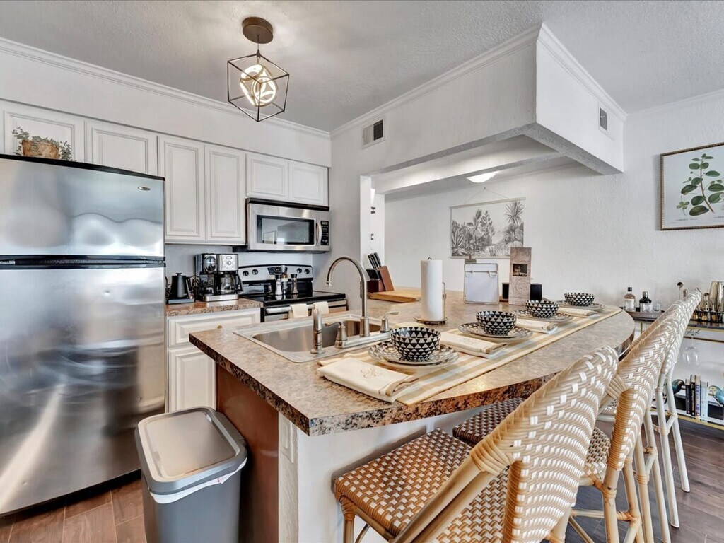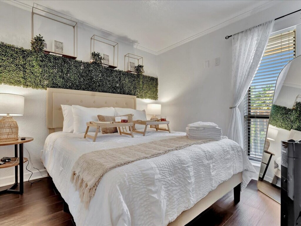 Welcome to Sea La Vie, a renovated European-style 1-bedroom condo at Sailport Waterfront Suites on Tampa Bay, where you can feel at home. Enjoy breathtaking panoramic views of Tampa Bay from your private balcony. This villa-style condo comfortably sleeps up to 4 guests and offers resort-style amenities. The fully stocked kitchen includes cookware, utensils, basics, a breakfast bar with 2 stools, a high-top dining table for 2, a Keurig coffee maker with K-Cups, a popcorn maker with fresh popcorn, and a cocktail bar with a mixology set, whiskey decanter, and glasses. Entertainment options include a 68” Smart TV in the living room and a 43” Smart TV in the bedroom, both supporting streaming via your own accounts. An extra queen-size air mattress and a Pack ‘N Play are available upon request. Located in Rocky Point, this apartment is close to hotels, small bars, restaurants, and brunch spots. Whiskey Joes, a popular indoor and outdoor beach bar and restaurant with live music, is a short walk away, as is a large public beach. Several restaurants are very close to the resort, and Instacart delivers directly to the unit. A digital rental agreement must be signed and a copy of a legal ID with a verification selfie must be provided prior to arrival. Standard check-in is at 4 PM EST and check-out is at 11 AM EST. Unauthorized late checkouts or early check-ins will result in a charge of $35 for every 30 minutes. Emotional Support and Service Animals are permitted with prior notice, written approval from the Manager, and supporting documentation provided to security upon arrival; a $100 pet fee applies. Pets are not allowed on beds or couches, and unauthorized pets incur a $250 penalty per pet and possible reservation cancellation without refund. Guests must clean up after pets, and failure to do so results in a $50 penalty. Unless requested and approved in advance in writing, lethal weapons are not allowed on the property, and a violation of this rule will result in immediate removal from the property along with no refund and a penalty of $250. Please keep the thermostat set to “AUTO” mode and do not set the temperature lower than 71°F to prevent system issues. Weekday daytime noise is possible due to neighbors’ projects or renovations and other activities. [SI]