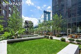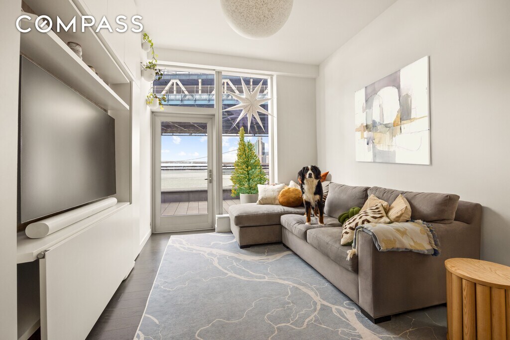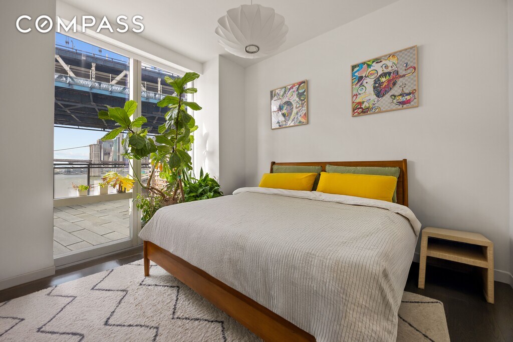 This south facing one bedroom residence combines modern luxury with a level of private outdoor living that is exceptionally rare. As one of the very few homes in the building that feature an expansive private terrace, this residence offers a coveted indoor and outdoor lifestyle and features 1,100 square feet of total living space. Positioned on the seventh floor with a commanding view over the Manhattan Bridge, the home enjoys sweeping panoramic views across the East River, the Brooklyn Bridge, and Downtown Manhattan. The interior is light filled and refined, featuring wide plank oak flooring and a thoughtfully designed layout that flows seamlessly to the 400+ square foot private terrace. The kitchen is equipped with top tier Miele appliances and sleek custom cabinetry, while the spa inspired bathroom includes marble tile walls, mosaic floors with radiant heating, a deep soaking tub, Dornbracht fixtures, and a newly upgraded frameless glass shower enclosure crafted for a clean and luxurious finish. The bedroom receives abundant natural light and has been enhanced with customized Nordic design ceiling lighting. Additional upgrades throughout the home include coordinated Nordic ceiling lighting in the living room, dimmers for the most used lights including in the washroom, and automated blackout shades from The Shade Store in the living room which provide comfort and privacy. A premium wall bed from Resources Furniture enhances the flexibility of the space and creates a comfortable setting for overnight guests. This installation includes a queen size mattress, a built-in television mount on the reverse side, and a suite of custom storage that offers the functionality of two closets plus overhead storage. A private in unit washer and dryer add another layer of convenience. One Manhattan Square provides an unmatched luxury lifestyle supported by over 100,000 square feet of indoor and outdoor amenities. Residents enjoy a full service environment including a 24 hour doorman, concierge, indoor pool, state of the art health club, yoga studio, pet spa, and residents lounge. Additional offerings include a basketball court, children's playroom, golf simulator, and screening room. With close proximity to celebrated dining, culture, and waterfront recreation, this residence delivers a sophisticated and contemporary urban experience anchored by extraordinary private outdoor space.