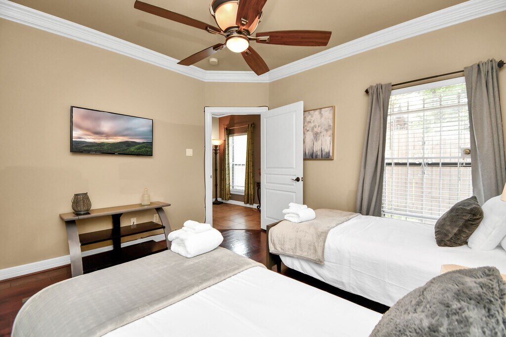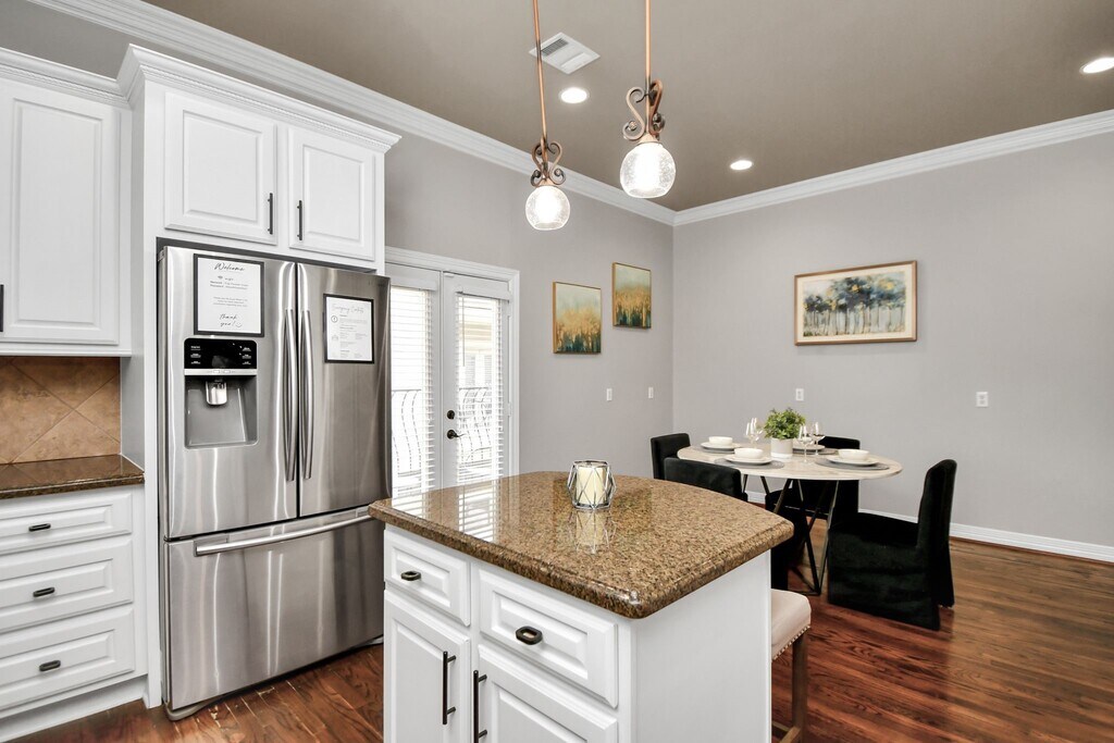 For lease FURNISHED. Modern 3-bed,3.5-bath end-unit townhome in a gated community near the Medical Center,Hermann Park,& Museum District. This updated 3-story home features hardwood & tile floors,high ceilings,abundant natural light,& a private balcony nestled between the flex room & kitchen. The flex room is perfect as a home office or cozy breakfast nook. Entertain in style with a custom dry bar (yes,there’s a wine fridge!) & a bright open layout. The chef’s kitchen boasts Taj Mahal quartzite counters,marble backsplash,pot filler,new stainless appliances,pantry,& a large island. Each bedroom has its own full bath for ultimate comfort. The dreamy primary suite includes dual vanities,jetted tub,separate shower,& walk-in closet. Additional features: tankless water heater,fresh paint,updated half bath,full-size washer/dryer,2-car garage,& fenced front yard. Ideal for professionals or families with quick access to Rice,UH,Midtown & more. Available now. MLS# 42004561