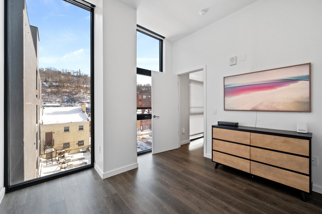 Discover modern urban living in this two-bedroom, two-bath condo located in the heart of Pittsburgh’s highly sought-after Strip District neighborhood. Residence 407 at 2554 Smallman offers an open-concept floor plan, private balcony, and stunning city views within one of Pittsburgh’s most vibrant walkable communities. This contemporary condo features a spacious kitchen with modern finishes that flows seamlessly into the living and dining areas, creating the perfect space for entertaining and everyday living. Oversized curtain walls provide abundant natural light and showcase sweeping views of the Downtown Pittsburgh skyline. The private primary suite includes a walk-in closet and en-suite bathroom, while the second bedroom and full bath offer ideal flexibility for guests, a home office, or work-from-home lifestyle. In-unit laundry, generous storage closets, and secure building access add everyday convenience. James Café on the street level for your morning routine or quick snack. Enjoy true walkable city living just steps from Pittsburgh’s best restaurants, coffee shops, boutiques, fitness studios, nightlife, and the riverfront trail system. This prime location offers quick access to Downtown Pittsburgh, Lawrenceville, the North Shore, hospitals, universities, and major highways, making commuting effortless. One car-deeded garage parking and a dedicated space. No pets. A 6-month fully furnished lease option is available for a fee. Credit and background checks are required by the HOA, along with a deposit of the first month's rent.