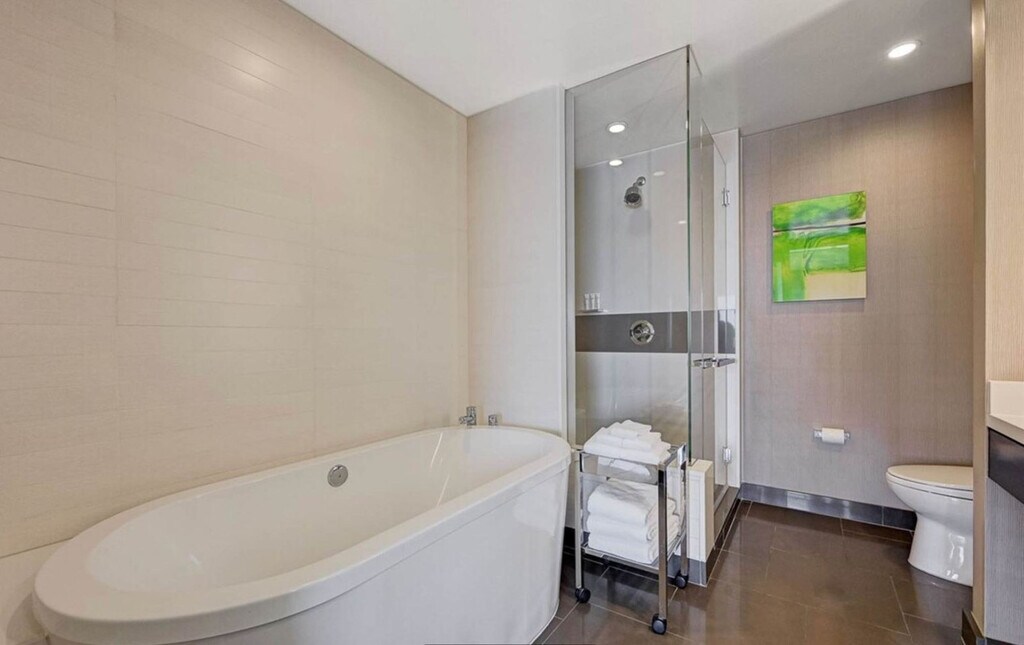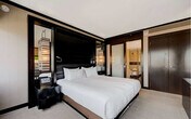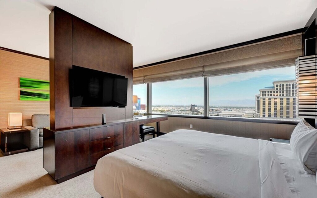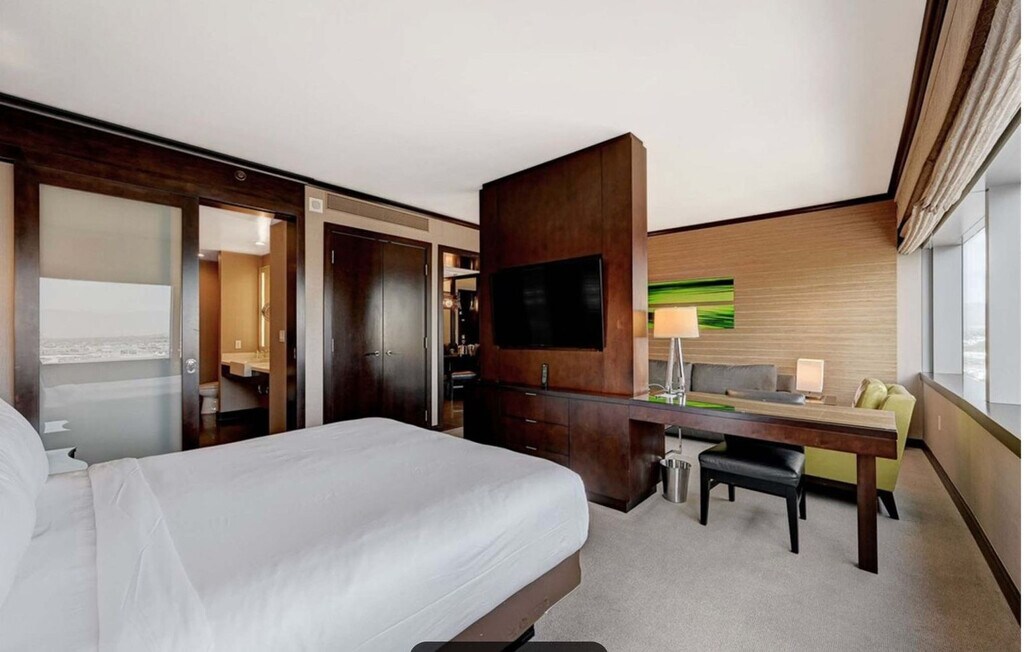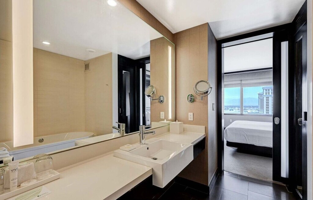 Feel at home in this luxury 1-bedroom condo located on the 22nd floor of the Vdara Hotel & Spa, an elegant non-casino, non-smoking, all-suite hotel within MGM’s CityCenter. Enjoy panoramic views of the Strip and full hotel amenities. This suite showcases breathtaking 180° panoramic views of the Las Vegas Strip, including the Bellagio Fountains, The Sphere, and the LINQ High Roller. The climate-controlled suite features a king-size bed and two 42” flat-screen TVs. The modern kitchenette is finished with marble surfaces, stainless steel appliances, and designer fixtures, including two minibar refrigerators, a two-burner stovetop, and a convection-microwave oven. Cooking utensils, plates, and silverware are available upon request from housekeeping, and pantry items (such as oil, salt, or spices) are available daily by contacting housekeeping. Unwind in a spa-inspired bathroom featuring a large soaking tub and separate walk-in shower. Complimentary valet parking is available. Full access to the pool, fitness center, and business center are included. On-site spa and salon are available for an additional fee. Daily housekeeping is available upon request for an additional fee, billed directly by the hotel. Situated in the heart of CityCenter, you’re just steps from ARIA, Cosmopolitan, and Bellagio, with easy access to The Shops at Crystals, Park MGM, T-Mobile Arena, and the free tram. Nearby attractions include the Fountains of Bellagio, Bellagio Conservatory & Botanical Garden, High Roller, Eiffel Tower Viewing Deck, Museum of Illusions, Welcome to Fabulous Las Vegas Sign, Flamingo Wildlife Habitat, Play Playground, Infinity Museum, Fly LINQ Zipline, Madame Tussauds Las Vegas, Caesars Palace, and the Las Vegas Strip. Fremont Street Experience and AREA15 are a short drive or rideshare away. Smoking is strictly prohibited inside the unit, and any violation will result in a $1,000+ deep cleaning fee. Quiet hours are between 10:00 PM and 8:00 AM. The primary guest must be 21 years or older and present a valid ID and credit/debit card at check-in. The hotel will place an incidental hold of up to $400, released after checkout if no charges are incurred. Check-in is at 4:00 PM and check-out is at 11:00 AM. Early check-in or late checkout requires prior approval. Guests have access to the entire unit except the locked owner’s closet in the bathroom. The living area is thoughtfully designed with a queen sleeper sofa, armchair, coffee table, and a dedicated workspace with LAN connectivity. [SI]