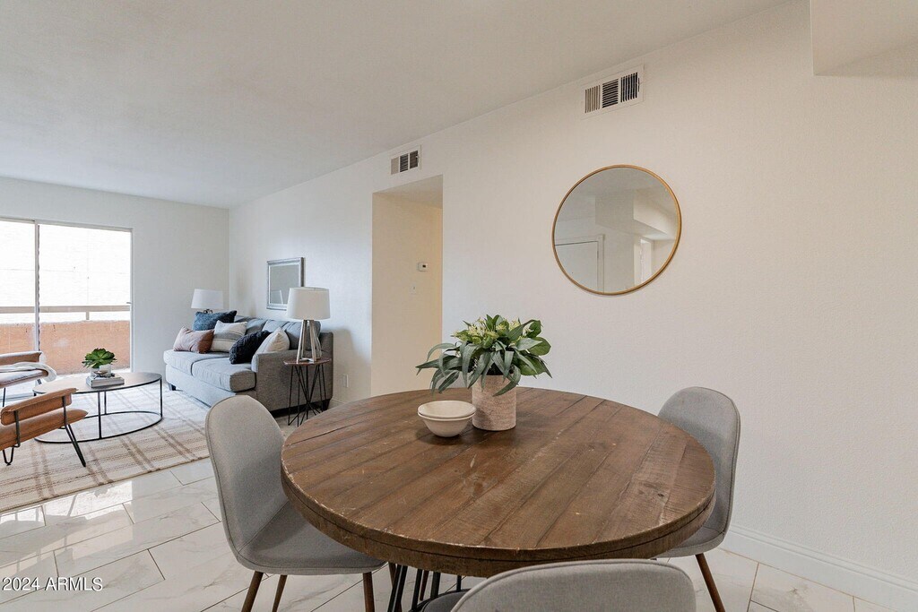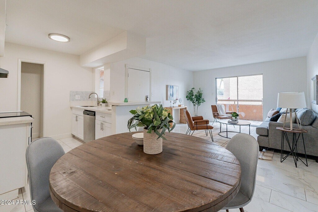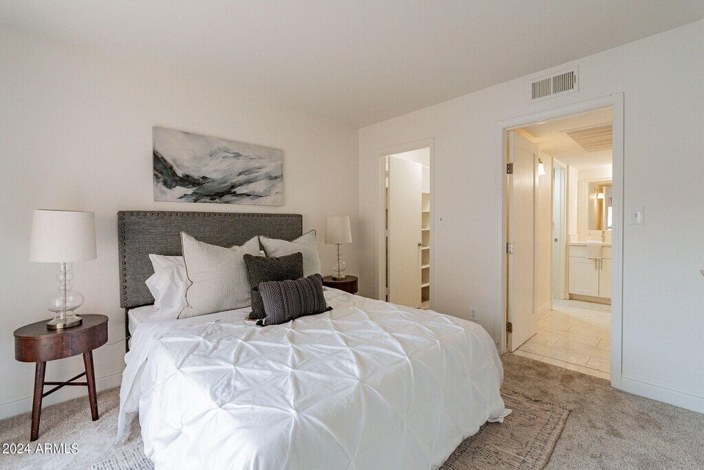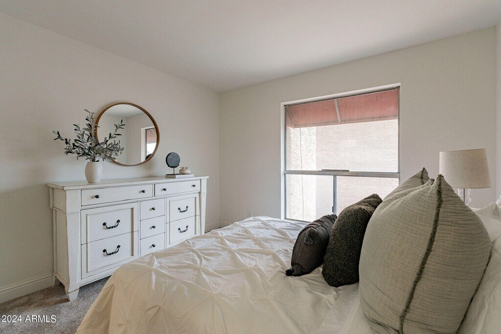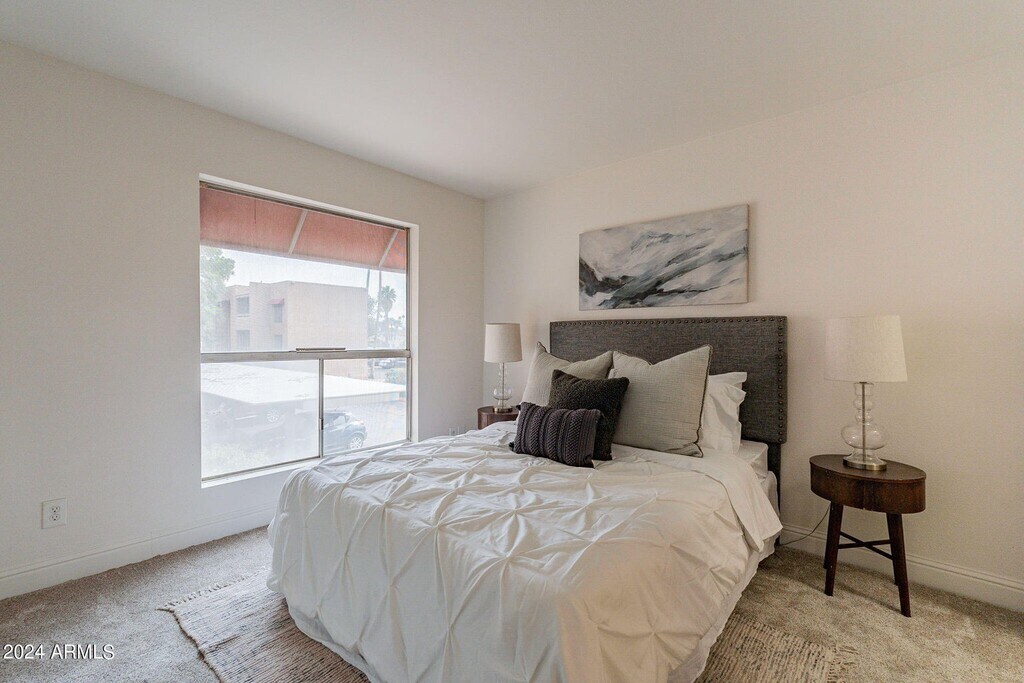 Enjoy resort-style living in this 2-bedroom,2-bathroom condo overlooking the sparkling pool in the heart of the desirable Biltmore/Arcadia area! This gated community offers top-notch amenities,including a pool,spa,and fitness center. Inside,you'll find a living room with cozy carpeting,blinds,chic light fixtures,and a soothing palette. The eat-in kitchen features wood-look tile flooring,wood cabinetry for maximum storage,a striking tile backsplash,and sleek SS appliances. The main bedroom offers a walk-in closet and a private bathroom for added comfort. The open layout and pool views create a comfortable retreat. Unbeatable location,just minutes from premier dining,shopping,and entertainment,with quick access to the SR-51,Loop 202,and Sky Harbor Airport. Don't miss it!